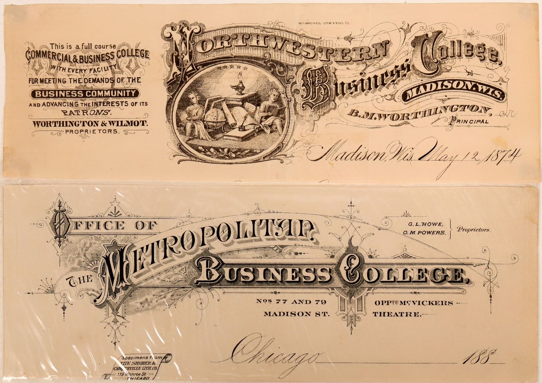 Lot of two printers' proofs of advertising coupons for the business colleges, Northwestern Business College in Madison, Wisconsin, and The Metropolitan Business College in Chicago, Illinois, c1870-1888. Printed by the Milwaukee Lith & Eng Co., and Shober & Carqueville, Chicago. For more details, see photo.