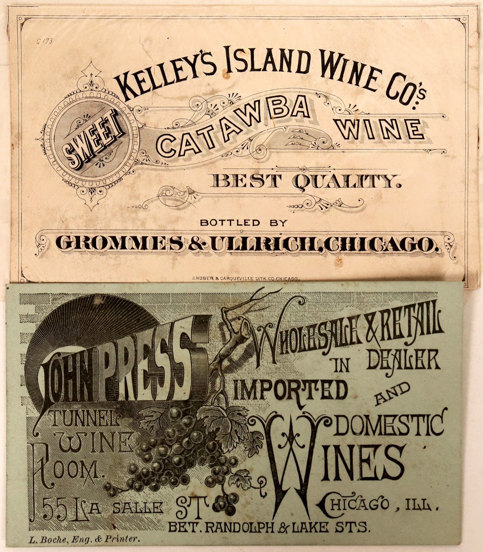 Two printers' proofs of a wine label and business card, from Chicago, c1870-1888. Kelley's Island Wine Co. label proof was printed by Shober & Carqueville Litho. Co., Chicago. John Press Wholesale & Retail Dealer in Imported and Domestic Wines, was printed by L. Boche, Eng. & Printer. Each is 3 x 5 inches. See photo for details.
