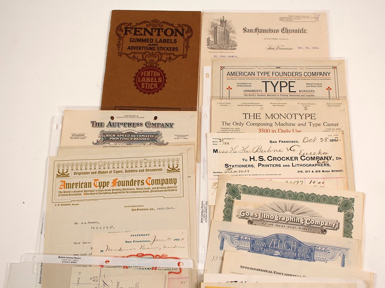 Huge lot of approx. 50 pieces of ephemera related to printing houses, presses, newspapers, and printing suppliers. Earliest piece is 1844, latest appears to be in the 1930s, with most clustered around 1900-1915. Includes: an 1844 subscription receipt for the New York Herald plus two c.188os for The Monitor (SF); four miniature (7 x 5 and 8 x6) souvenir copies of the San Francisco Chronicle, c. 1880s; color 1926 catalog for David C. Cook Publishing Co. Sunday School Supplies & Holiday Specialties; a mounted photograph of a man standing in front of an early printing press in Prairie City, Iowa; color 1922 Fenton Gummed Labels & Advertising Stickers catalog with sample label designs; rare 1876 billhead for the Deseret News, Salt Lake City; 1904 color billhead for William Brown Engraving Co., San Francisco; 1902 illustrated letterhead for the San Francisco Chronicle; two different 1911 letterheads for American Type Founders Company, SF; 1911 & 1917 letterheads for The Monotype, Lanston Monotype Machine Co., Philadelphia; 1892 billhead for H.S. Crocker Co., SF; 1911 letterhead for The Autopress Company (High Speed Printing Presses), New York; two fancy billheads and a letterhead for California Ink Co., SF, 1911-14; 1906 letterhead for HH Wilcox, Buffalo; 1914 billhead for Murray Engraving Co., Chicago; 1906 letterhead for Reed & Goodman Inks, SF; 1917 letterhead for North-of-the-Bay Counties Press Association; and much more! Please inspect! (Prag Collection) Date: Location: HWAC# 55665