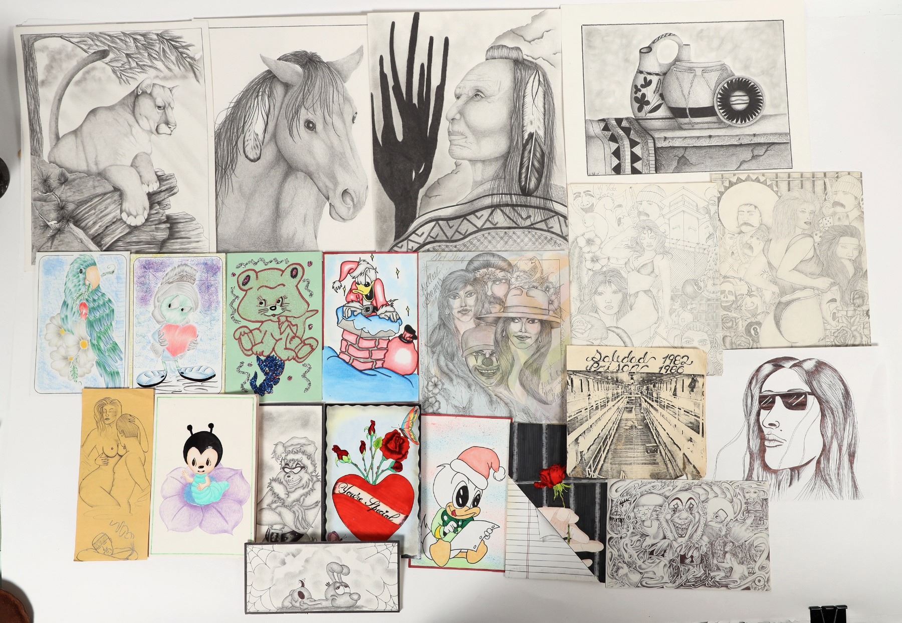 James Matthews was incarcerated for homicide and served life in prison. He was a father and grandfather, his great grand daughter provided these original art drawings. He was an untrained artist who learned in prison. The collection includes 14 or more original drawings of varying styles including cartoons clearly sent to his grand daughter and more intricate drawings perhaps more familiar today as tattoo style of art. Prison art as an art form has become a popular sub collecting category.