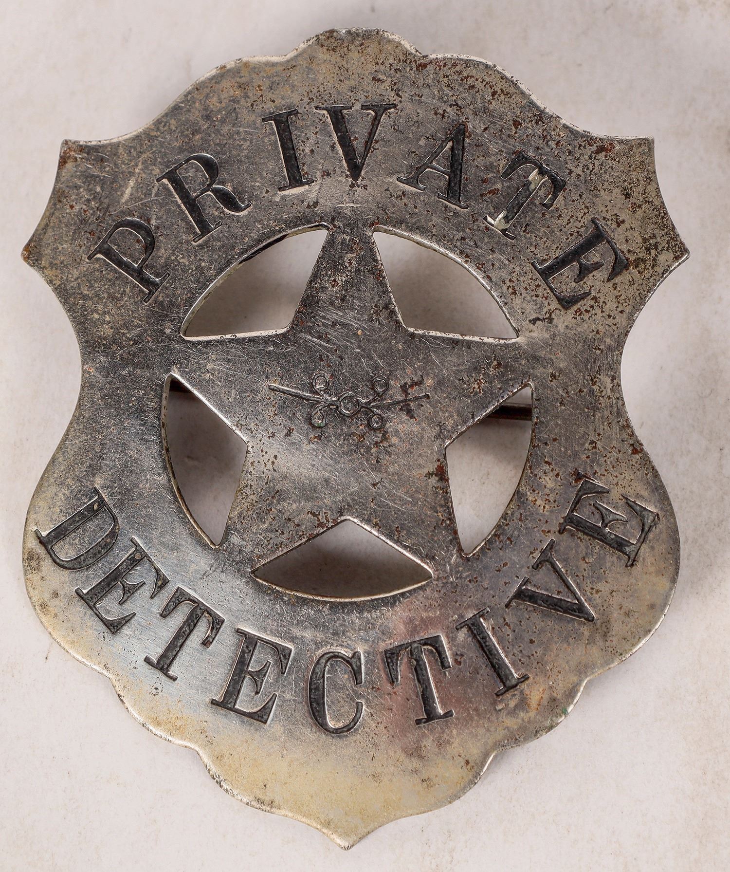 c. 1900-30 nickel plated brass Private Detective badge with unusual center symbol, see photo. 2.5x2.25" with pinback.