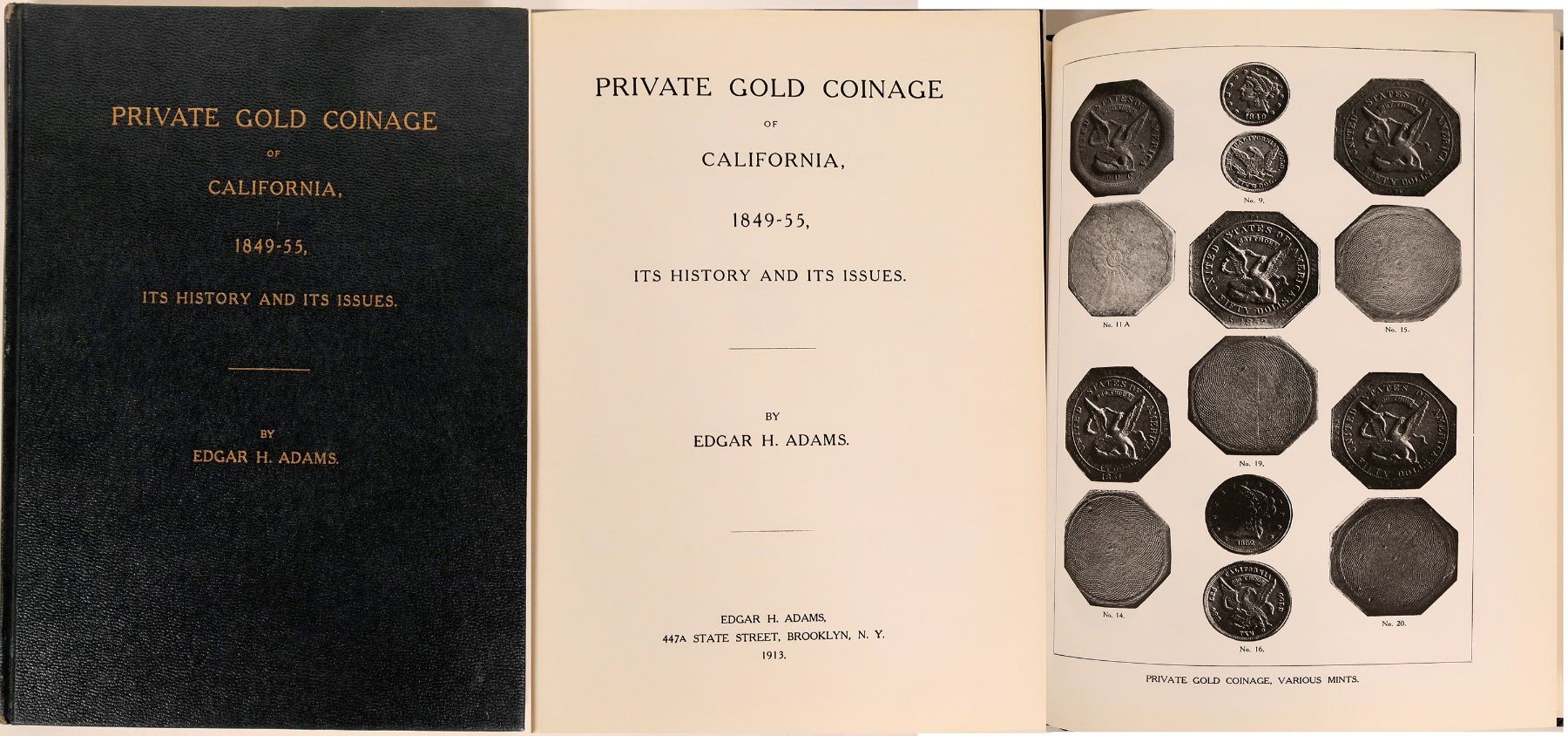 Lot of 1. Private Gold Coinage of California 1849-1855, ITS HISTORY AND ITS ISSUES by Edgar G. Adams. Reprint from American Journal of Numismatics 1912. This is rare early work on private gold coins. Hard cover. Good condition.