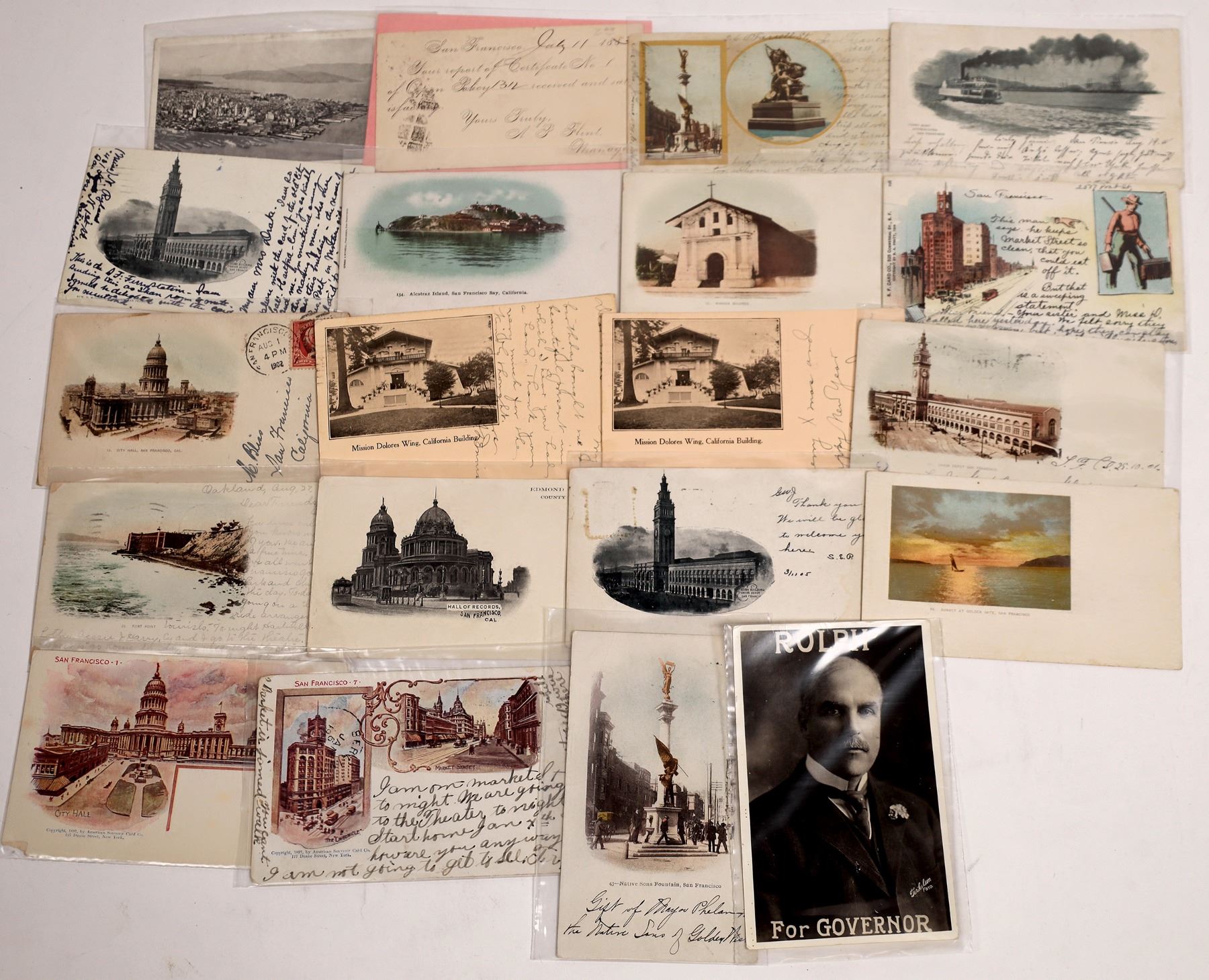 Lot of 14 Private Mailing Cards from San Francisco; two American-Souvenir-Cards; a post card dated 1883: a report of Certificate No. 1 of Open Policy 1312. A miniature post card air view of San Francisco and the Golden Gate. A real photo postcard advertising Rolph for Governor. State:California City:San Francisco Date: Provenance: Ken Prag Collection
