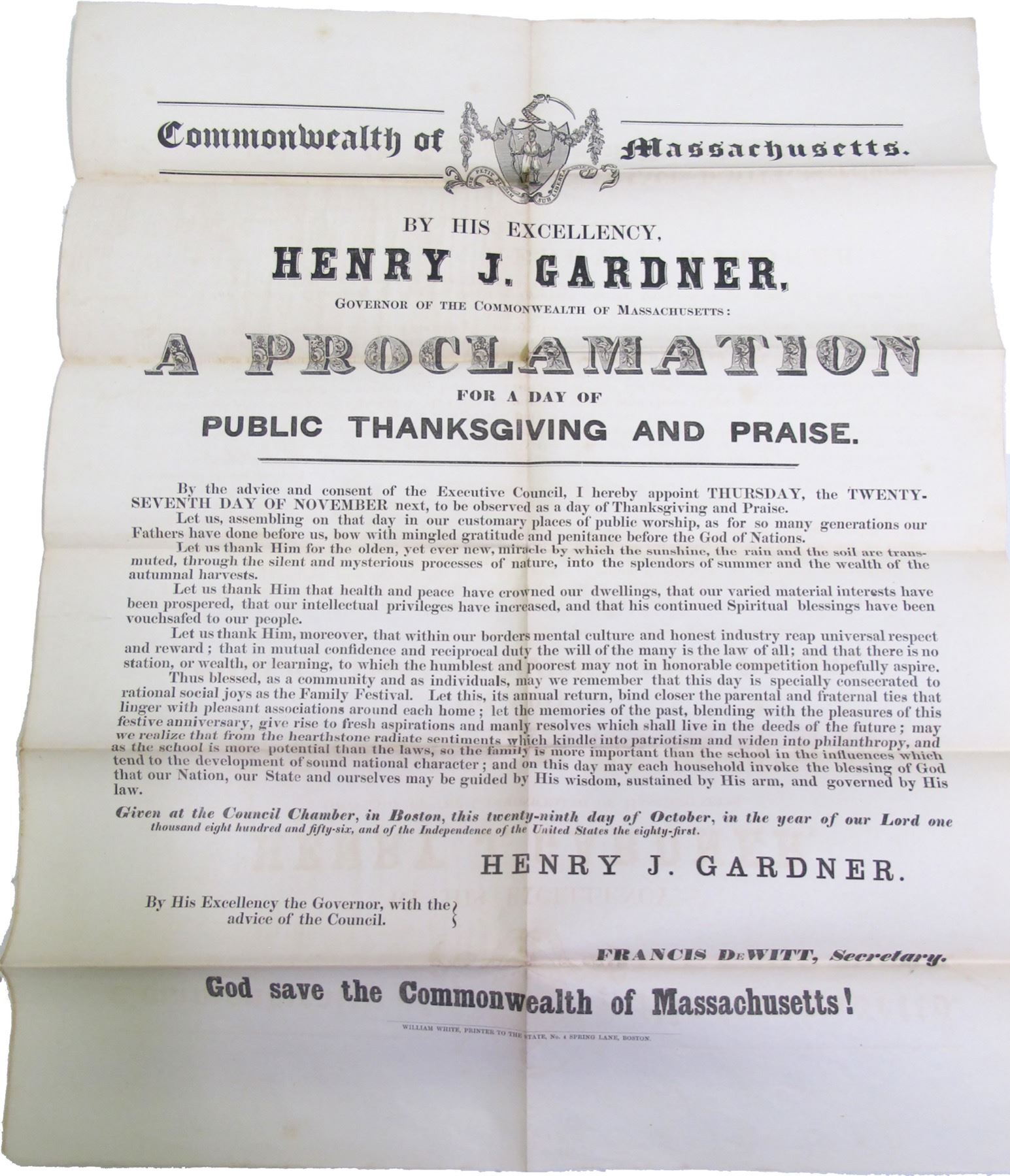 By His Excellency Henry J. Gardner, Governor of the Commonwealth of Massachusetts: Proclamation. "God save the Commonwealth of Massachusetts!" 18.5" x 23.5". Slight tears & foxing in center crease. Please inspect. Ready for frame. State: Massachusetts City: Boston Date: 1856 HWAC# 84435