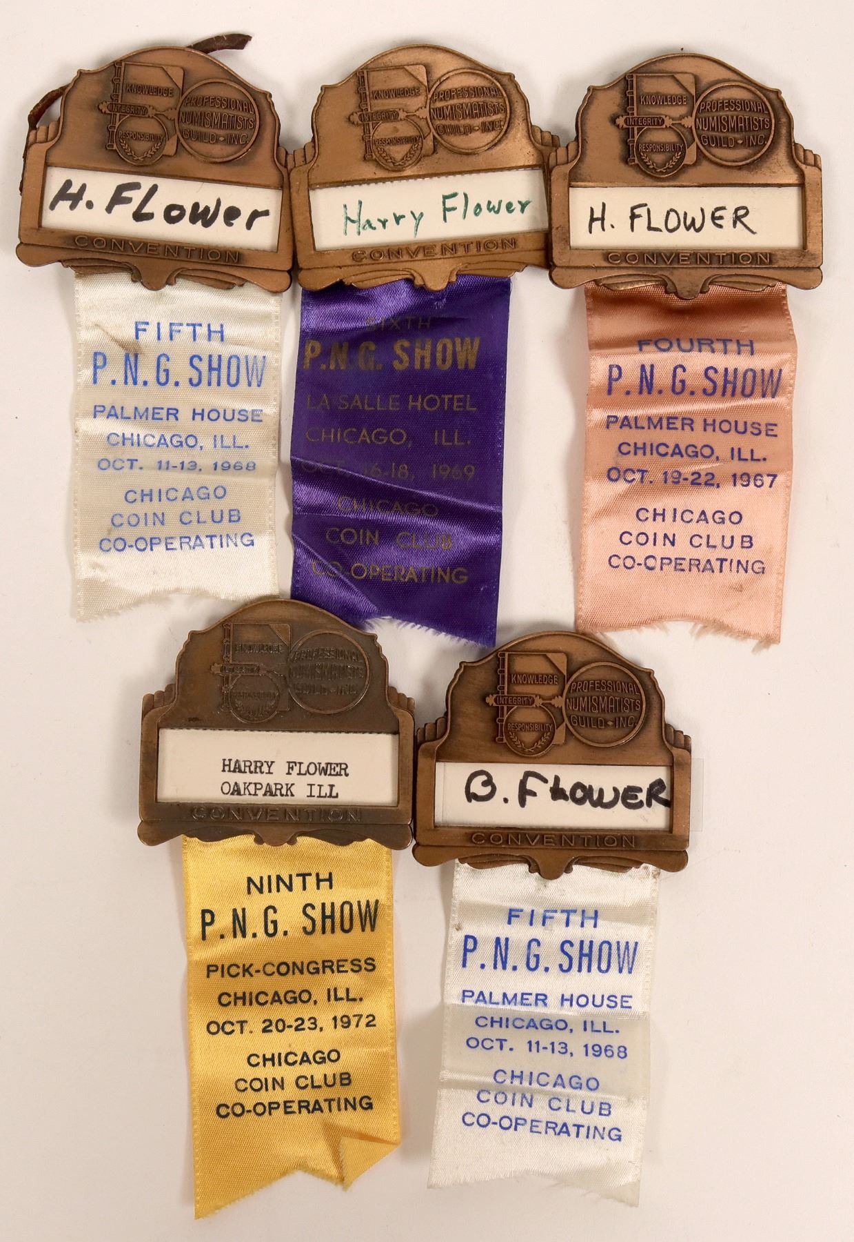 Lot of five Professional Numismatics Guild badges, from Chicago, Ill., c1967-1972. Includes pins with ribbons from conventions, from the fourth, fifth (2), sixth and ninth P.N.G. Shows, held at the Palmer House (1967 and 1968), Pick-Congress (1972) and LaSalle Hotel (1969). ATTENTION: BADGE COLLECTORS! SEE ADDITIONAL BADGES UNDER THE GENERAL AMERICANA, PHILATELIC AND DEALER SECTION OF SALE! Illinois Chicago 1967-1972 Benjamin Fauver Collection