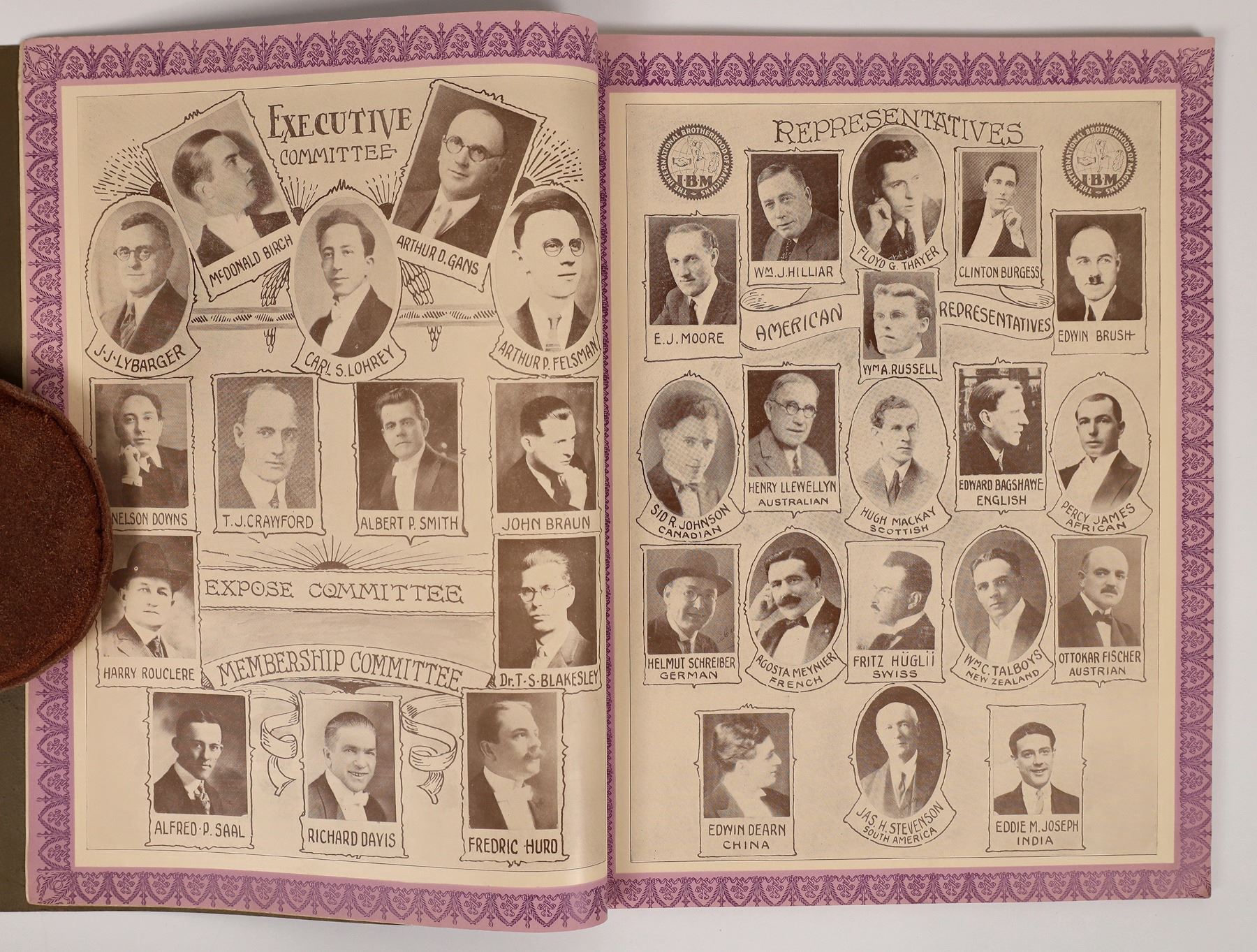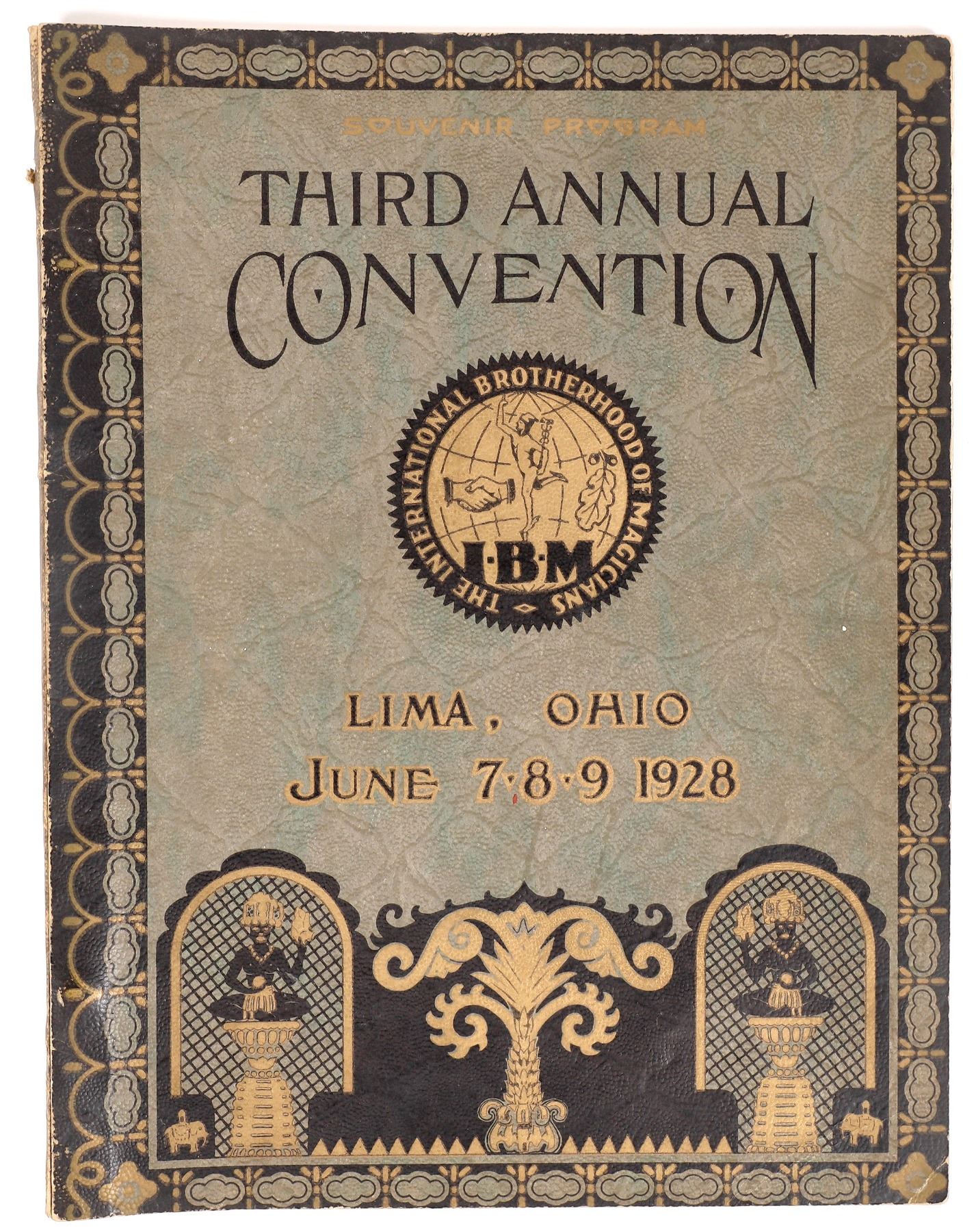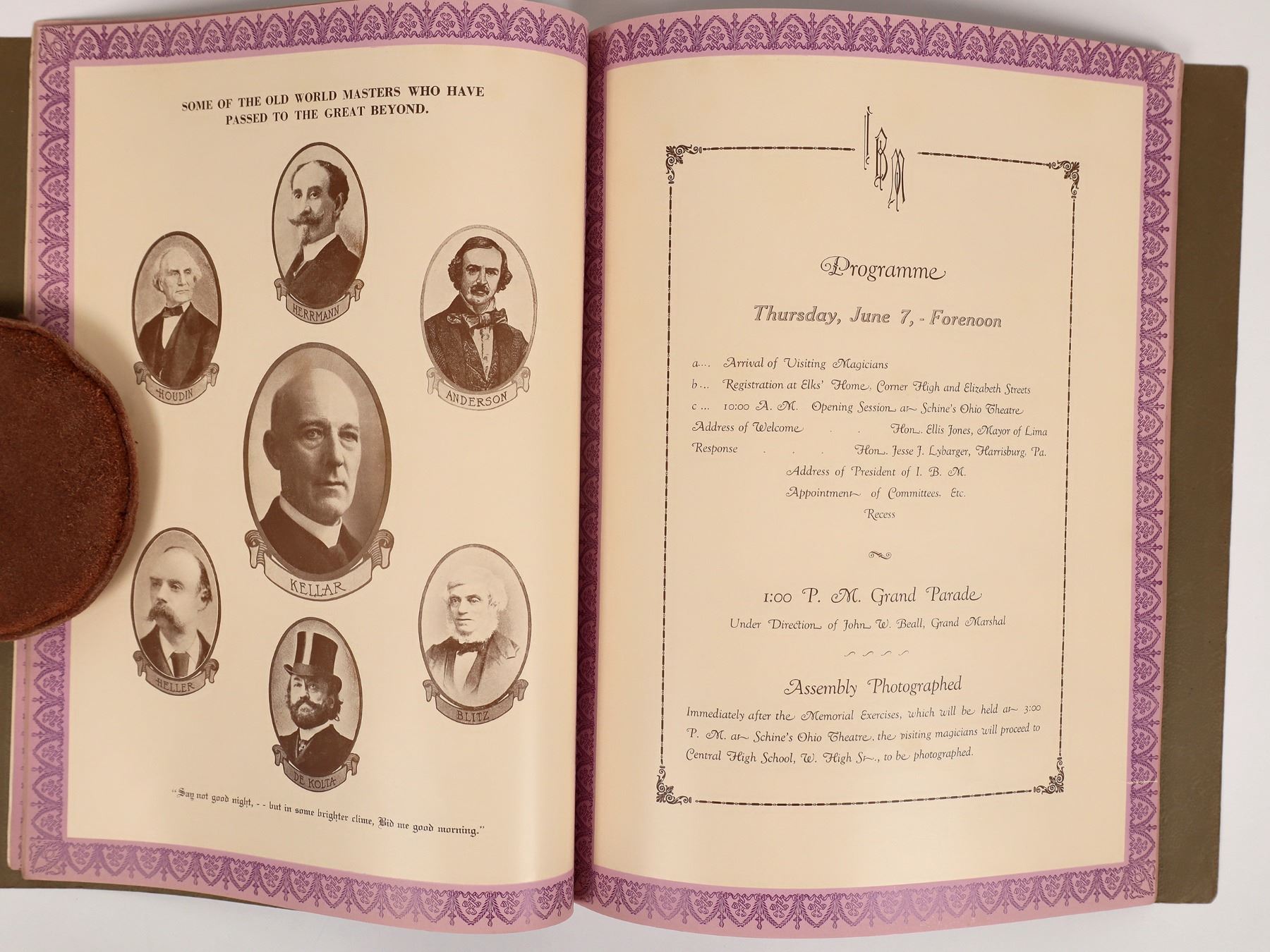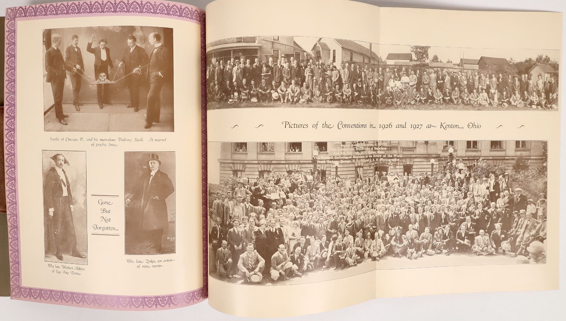 Fantastic! Illustrated program full of photos of the magician members and their acts, as well as a few articles, and a description of the various activities happening at this event that took place in Lima, Ohio, June 7th-9th, 1928. Not paginated, but approx. 50pp. Includes foldout panorama group picture. 12 x 9.25" Houdini had died just 2 years earlier. Famous magician Howard Thurston is listed as one of the vice presidents.