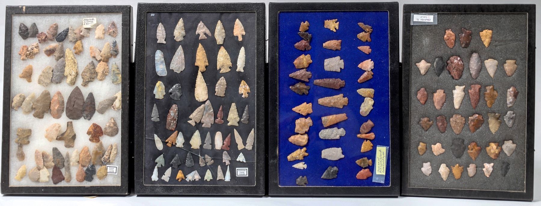 This lot has five riker boxes of points from Colorado, and one walnut display from Colorado and Wyoming. One box is bird points from eastern Col.; a box from Dolores County with Anasazi and Ute points, scrapers and knives, from Dove Creek, Col.; one box from Montezuma County, Col.; one box from Park County, Col.; one box from Chaffee County, Col.; and a walnut display box with both Colorado, and Wyoming points well displayed and cataloged. Over 280 points in all. State: Colorado, Provenance: Gary Bracken Collection
