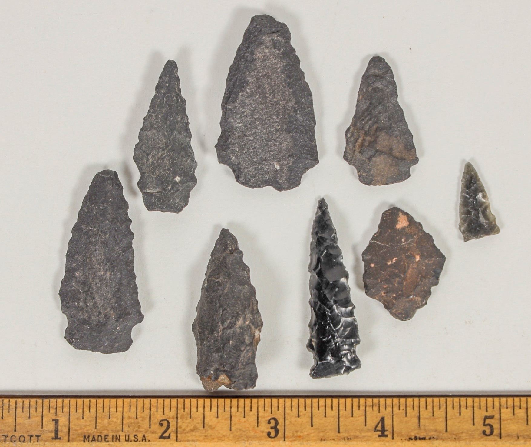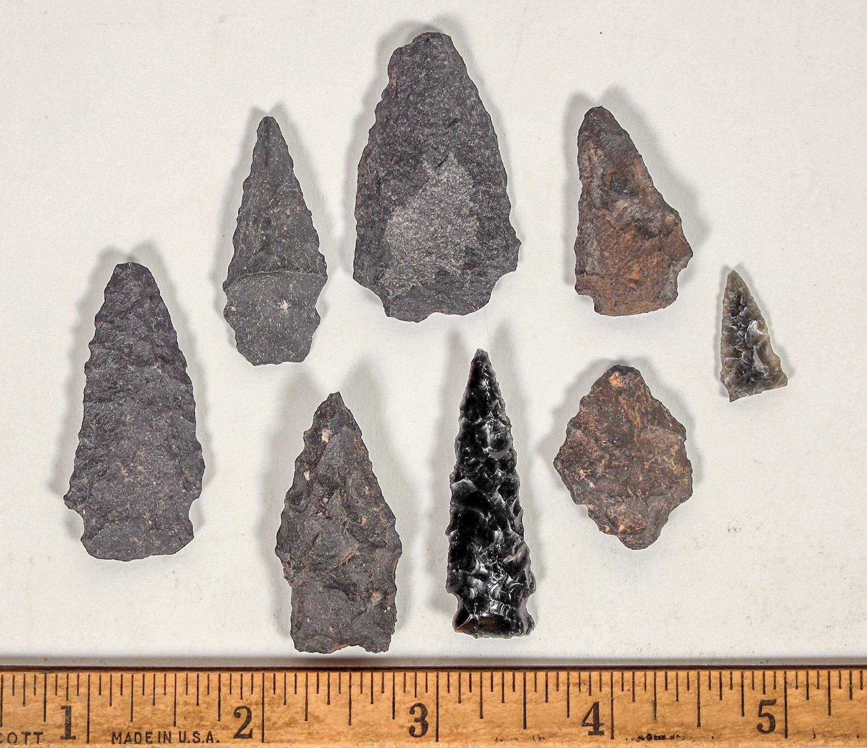 This collection of projectile points is from Washoe County, Nevada with six points of basalt or shale and two obsidian points. One obsidian point is complete as an Elko side notch and a smaller tip of obsidian. The basalt pieces are corner notches under 1.5 in.. Found on private land. Please see photos for details.