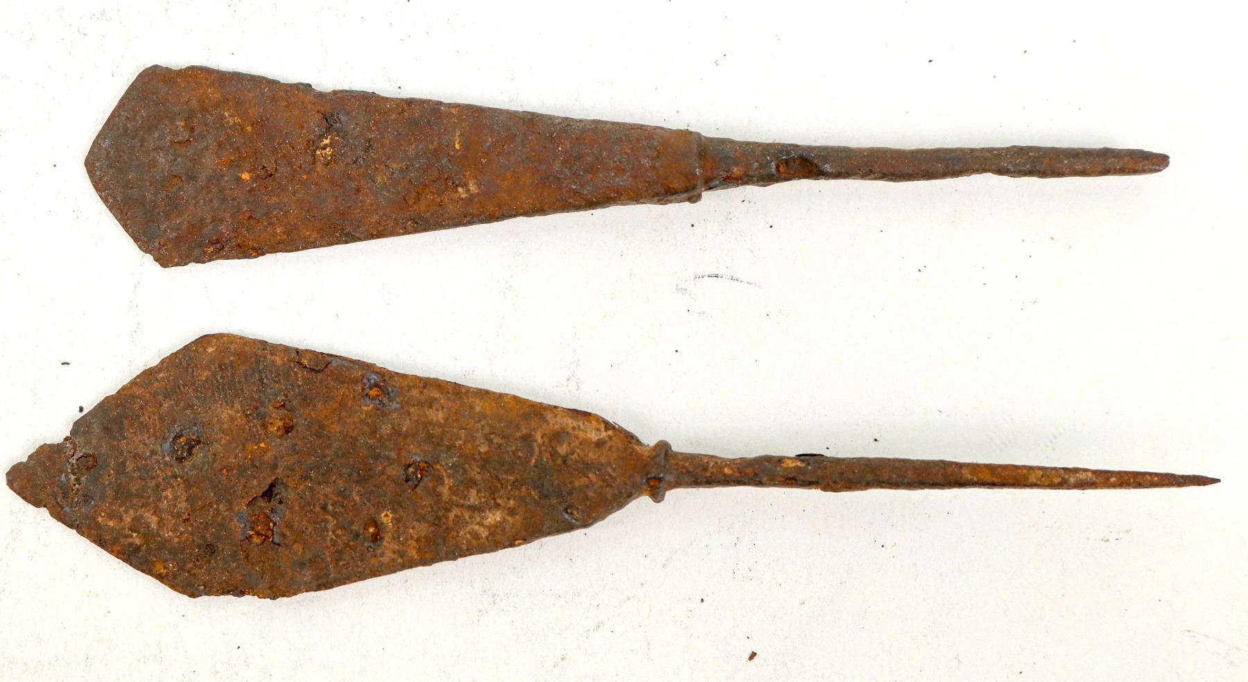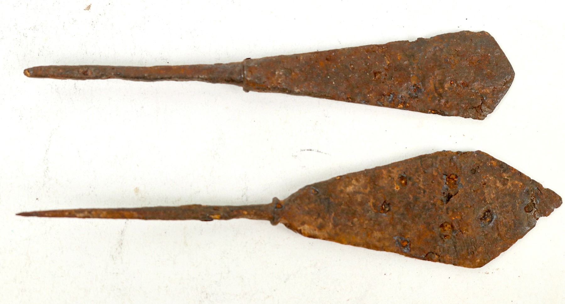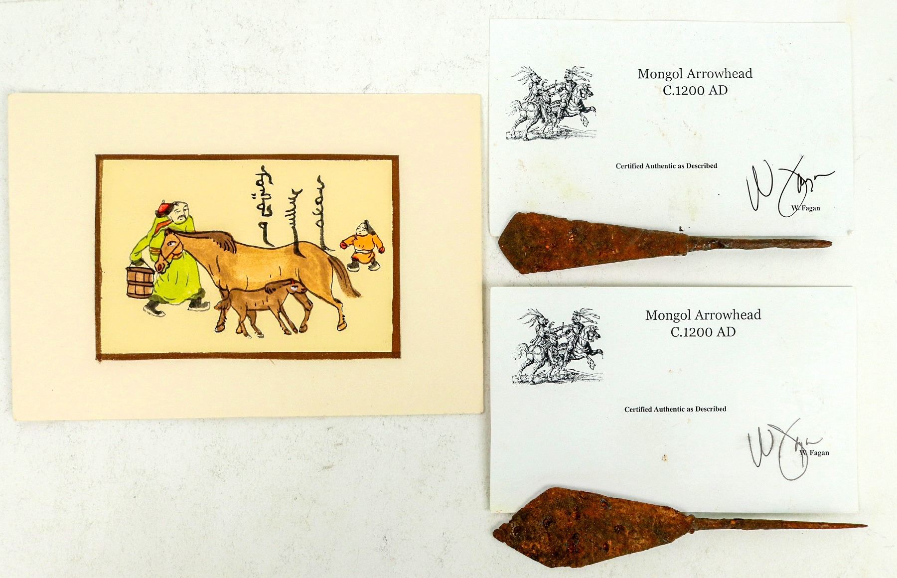There are two arrowheads or projectile points of iron from Mongolia in this lot. Used about 1200 AD. Overall lengths are: 4.5 in. and 5.0 in. The lot also includes a hand painted art cart depicting Mongolian farm life, at 4.5 in. X 6.0 in. Cards signed COAs from W. Fagan of Fagan Arms, Clinton, Mi. for both pieces. Please see photos for details.