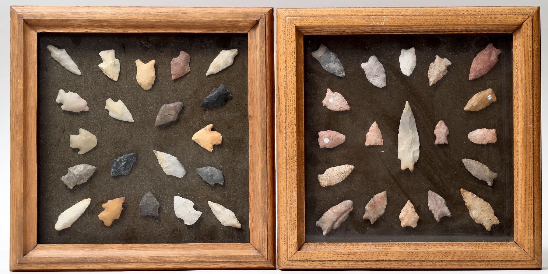 This lot has the most diversified lot of projectile points; from bird points to large game. Found in the eastern part of Oklahoma and very likely the western part of Arkansas. Early Paleo points and drills; about 130 pieces in all in six display boxes. From the Gary Bracken collection. Please see photos for details.