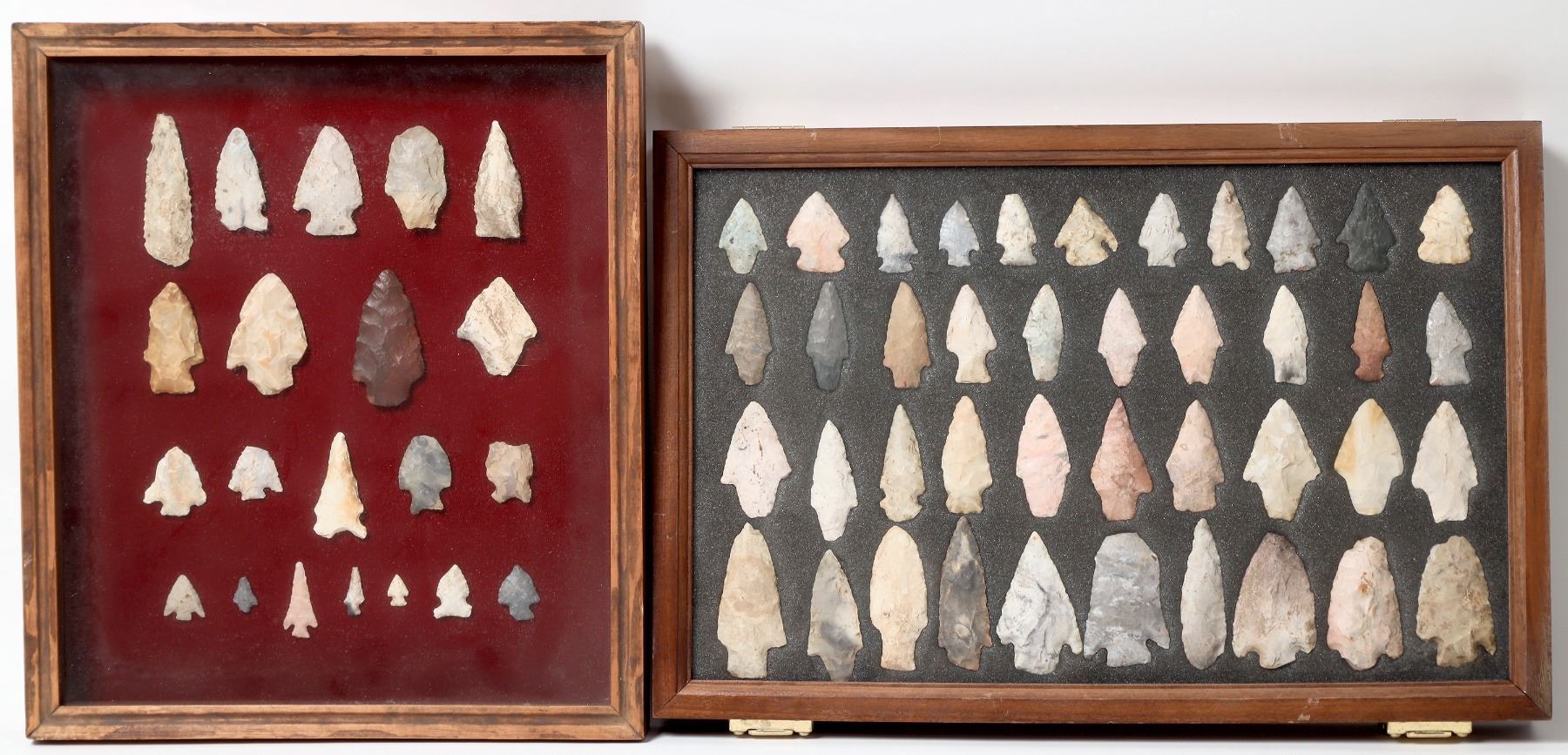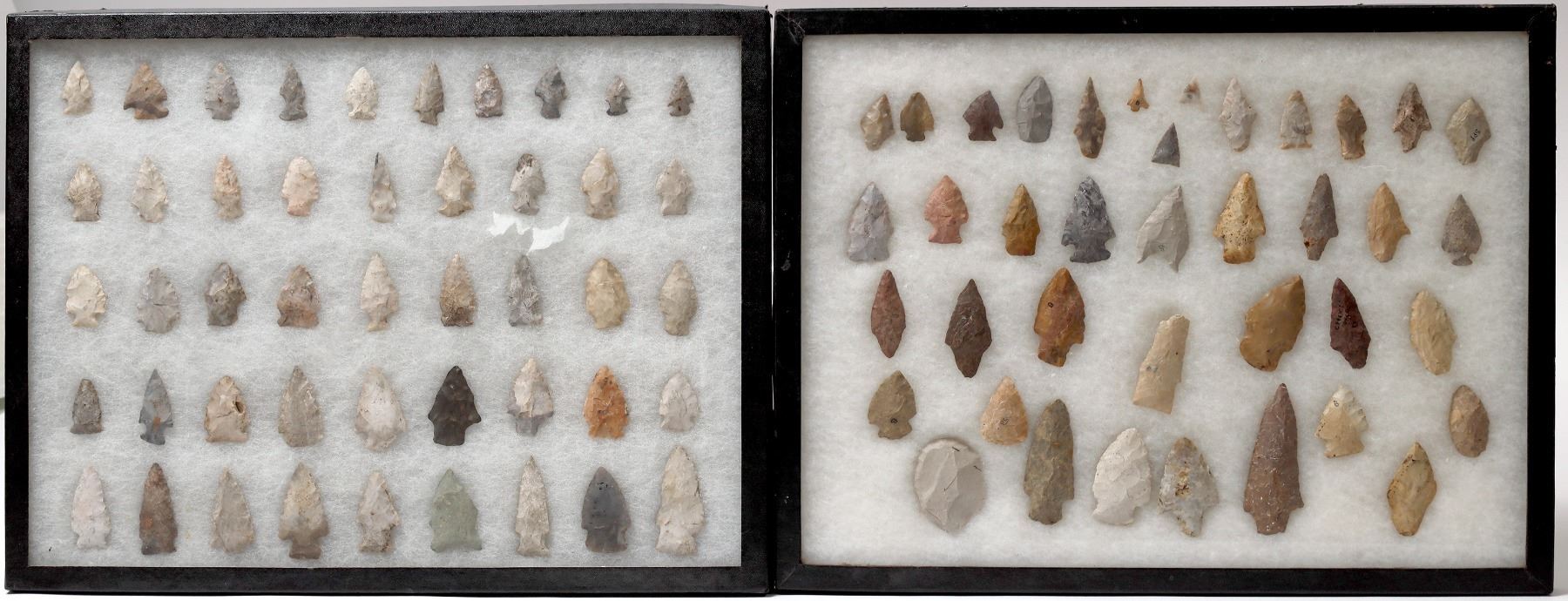 This collection is from Oklahoma and Missouri. There are five cases of points each with similar construction. A total of over 150 pieces. The case from Missouri has what appears to be a style of points from the Woodland period 3000 B.P. 1000 B.P. The largest points are at 2.5 in./ 63 mm. From the Gary Bracken collection. Please see photos for details.