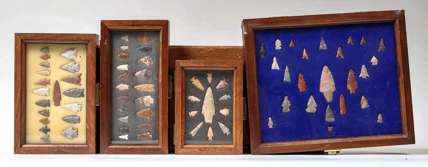 There are four Walnut display boxes with bird points from Southeastern states including Tennessee and Alabama. A total of about 70 points ranging from .675 in./41mm to 2.75 in./ 70mm. Colors range from white, pink-gray, gray. Gypsum cave points, side notch points, and pine tree corner notched est. 10,000-5,000 B.P. Please see photos for details. Provenance: Gary Bracken Collection