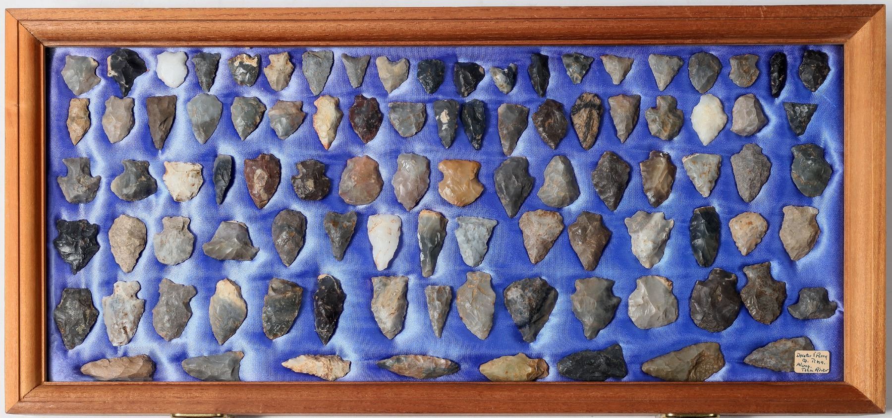 This display contains over 90 projectile points collected from the Decatur and Perry Counties of Tennessee along the Tennessee River. Most specimens are at 1.5 in./ 39 mm. In a blue satin display box at 19 in. X 9 in. Please see photo for details. From the Gary Bracken collection.