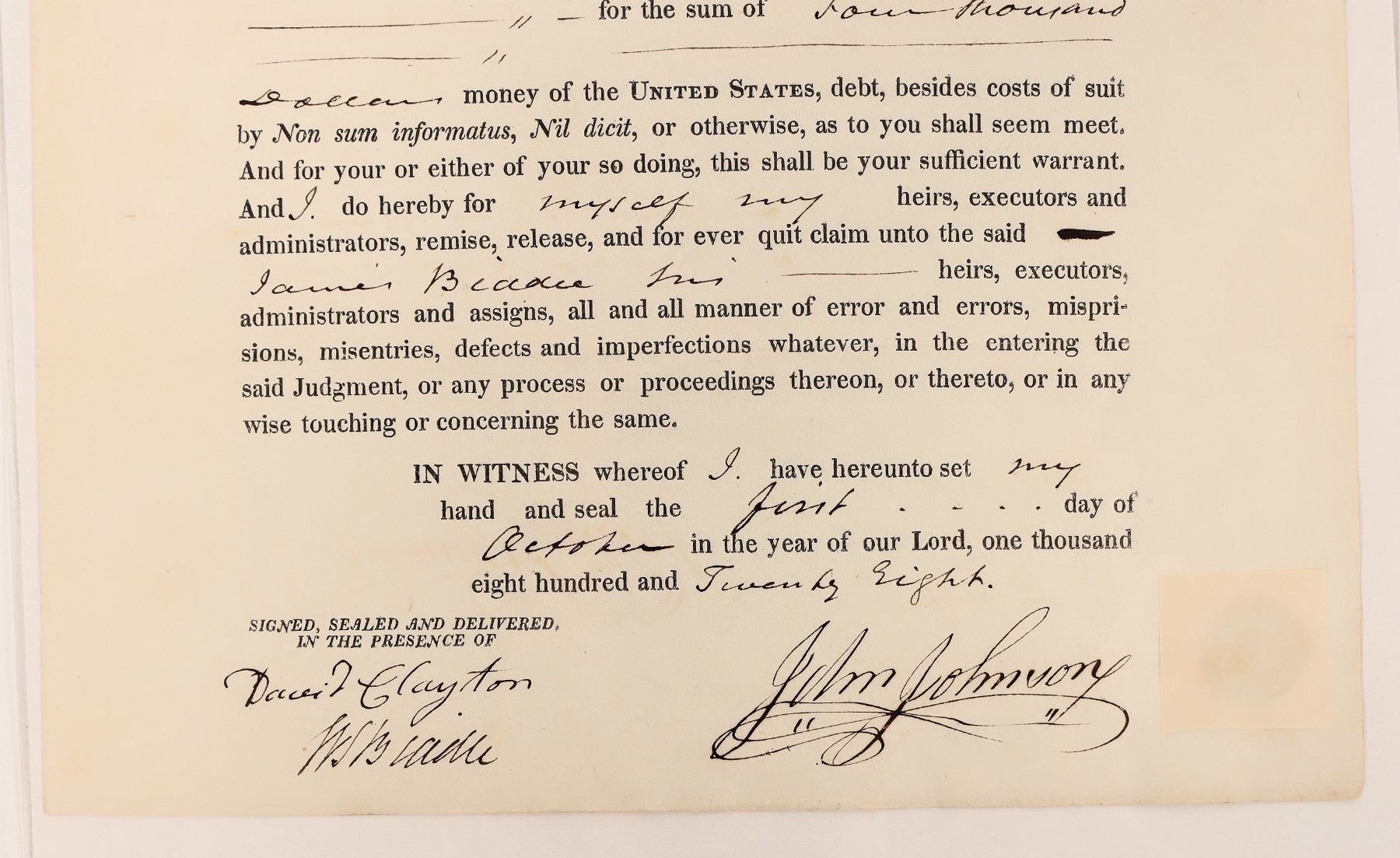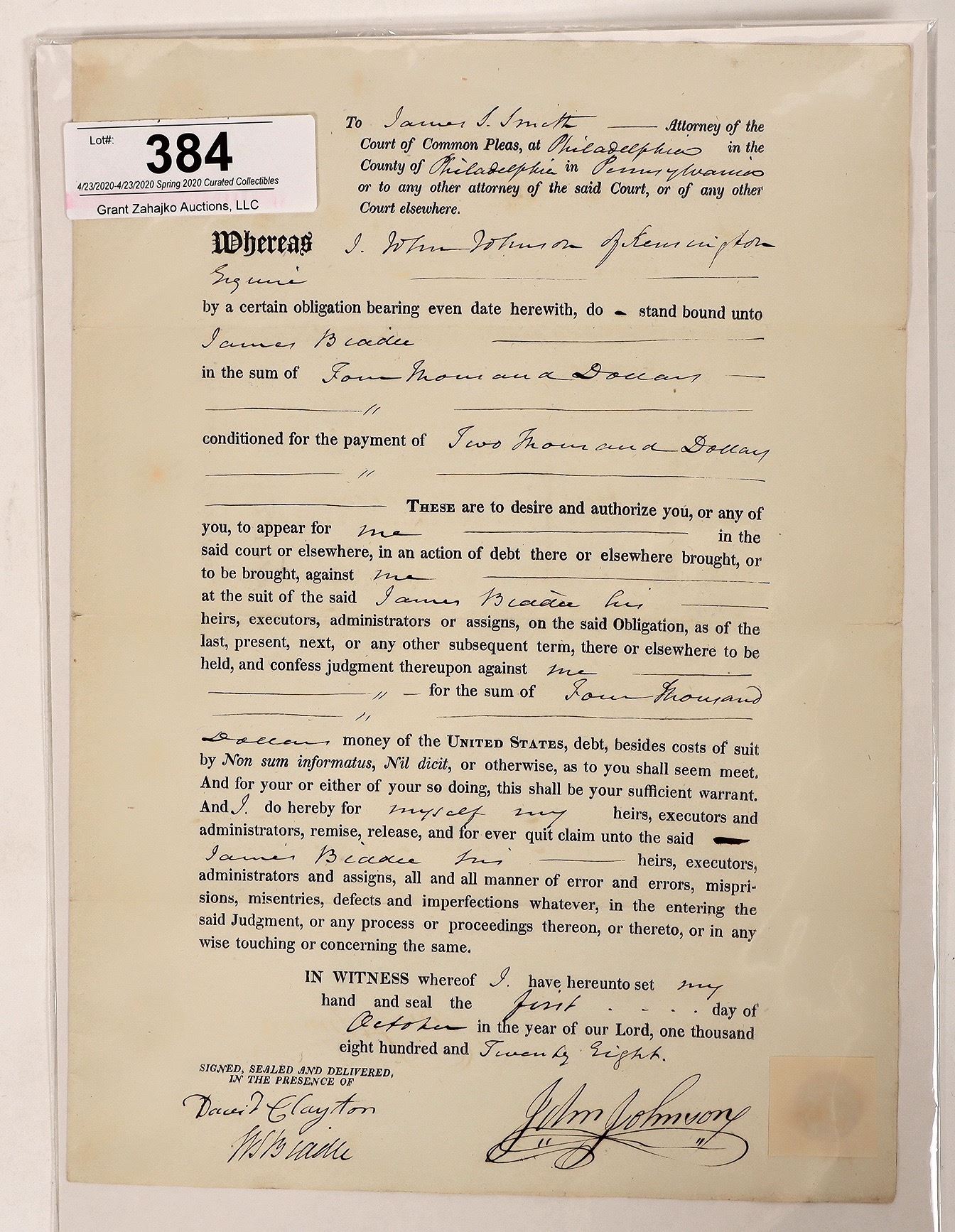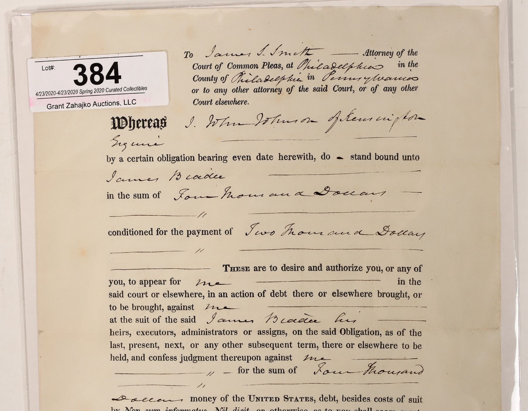 1828 Promissory Note filed with the Court of Common Pleas in Philadelphia, Pennsylvania. The note promises that the payer, John Johnson, will pay $4000 to one James Beadle. The note is printed, with details such as names, dates, and sums filled in by hand. Very good condition, with a few extremely small tears at the edge of the paper. [ Philadelphia Pennsylvania