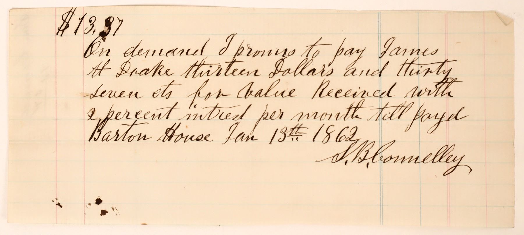 A Promissory Note written by S.B. Connelley to James H. Drake of Barton House for a toll of $13.37. Barton House was the first brick building in Redlands, California. California Redlands 1862 Redlands California