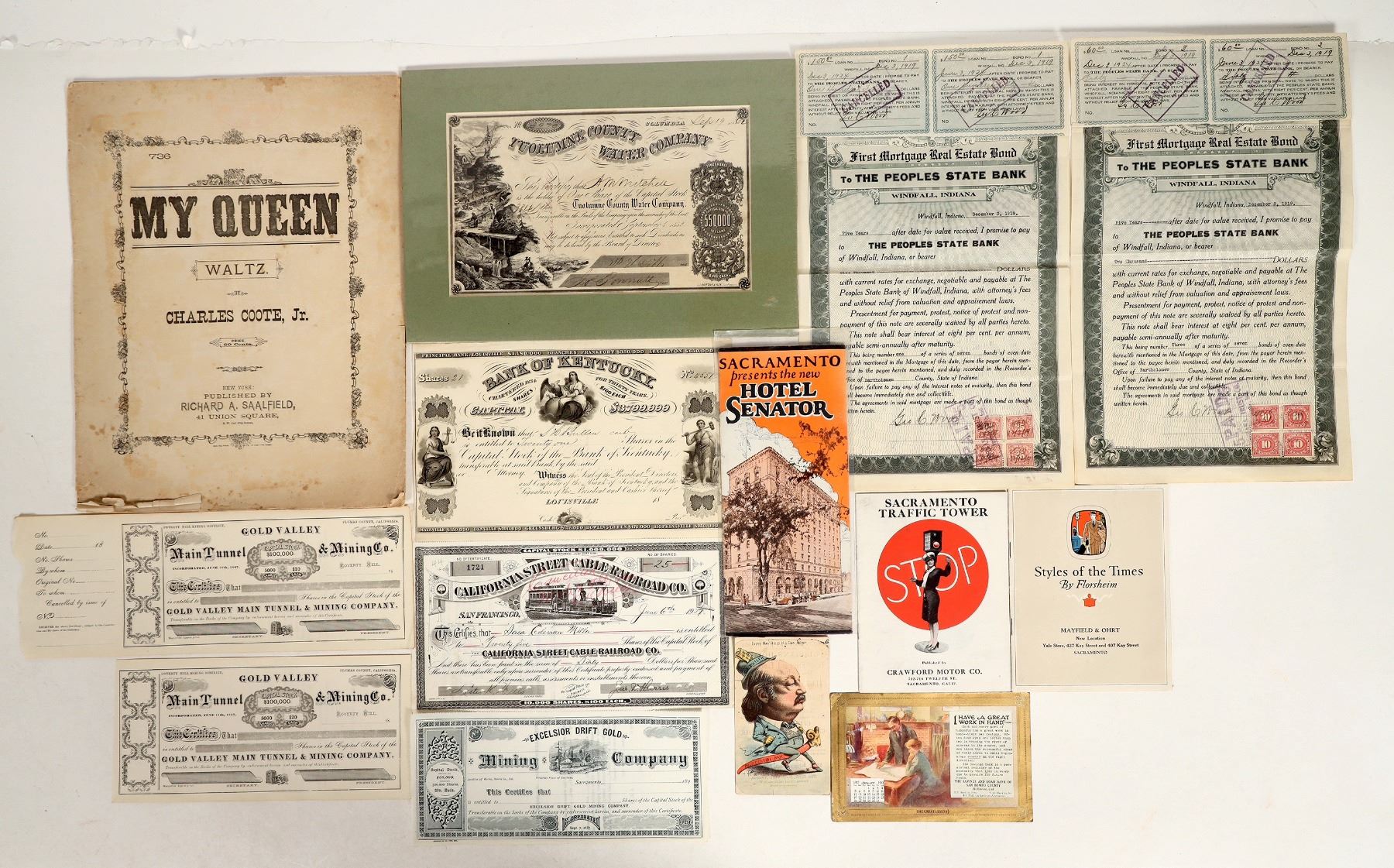 Includes an announcement for the Hotel Senator, a 1926 men's shoe style guide by Florsheim, & Sacramento Traffic Tower booklet by Crawford Motor co. Includes a foxed/toned flyer for a ship ball and a variety of assorted stocks, issued and unissued. Overall, approximately 50+ pages of material in good condition. See photo.