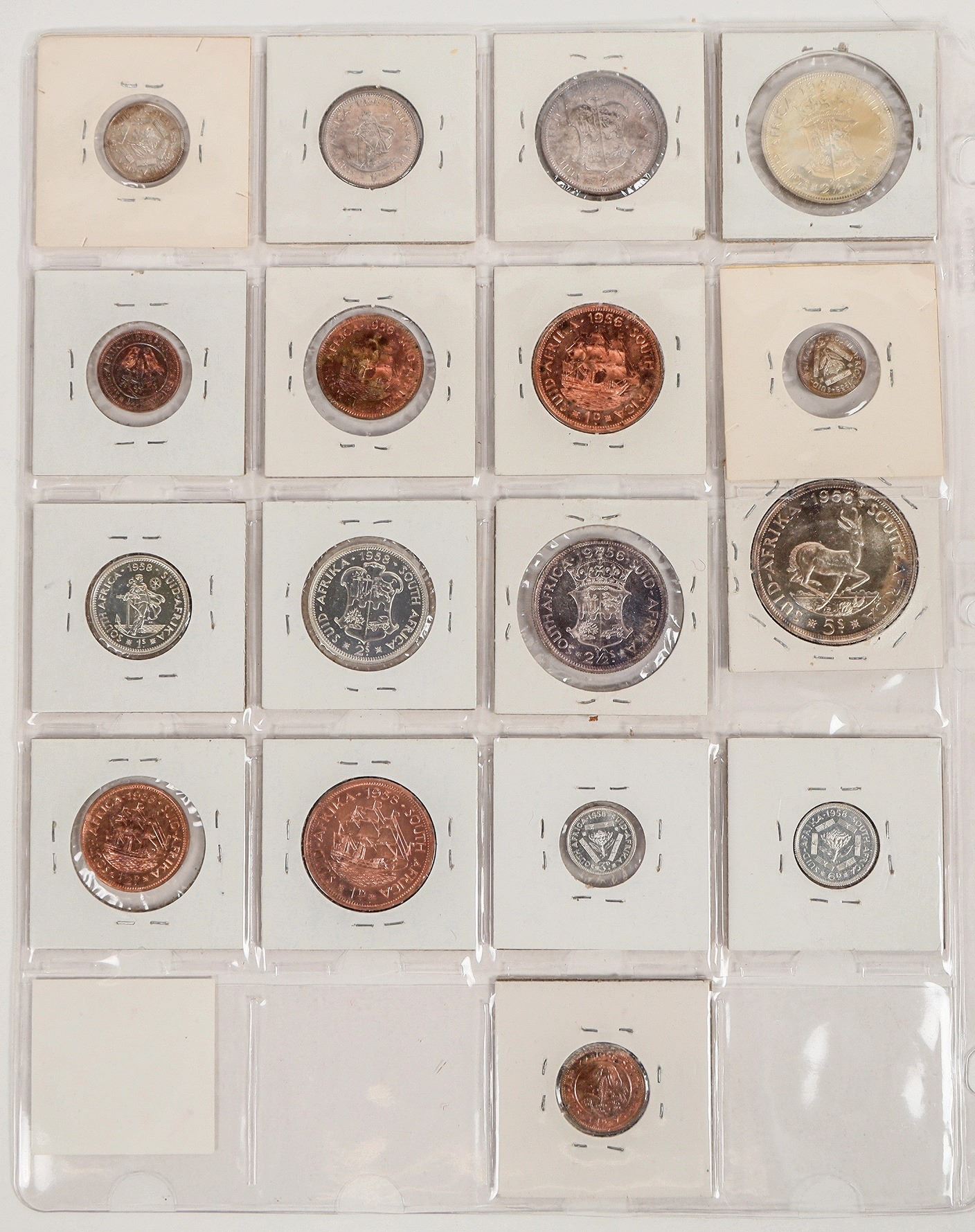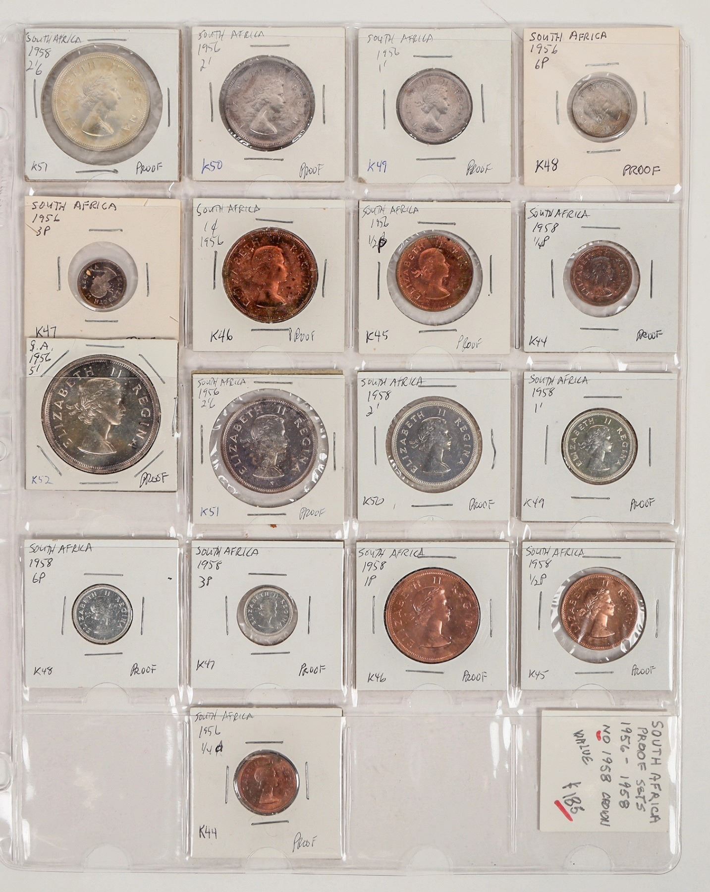 Proof sets of South Africa coins 1956 & 1958, missing only the 1958 crown. Nine coins from 1956; eight coins from 1958. The major denomination coins are .500 silver.
