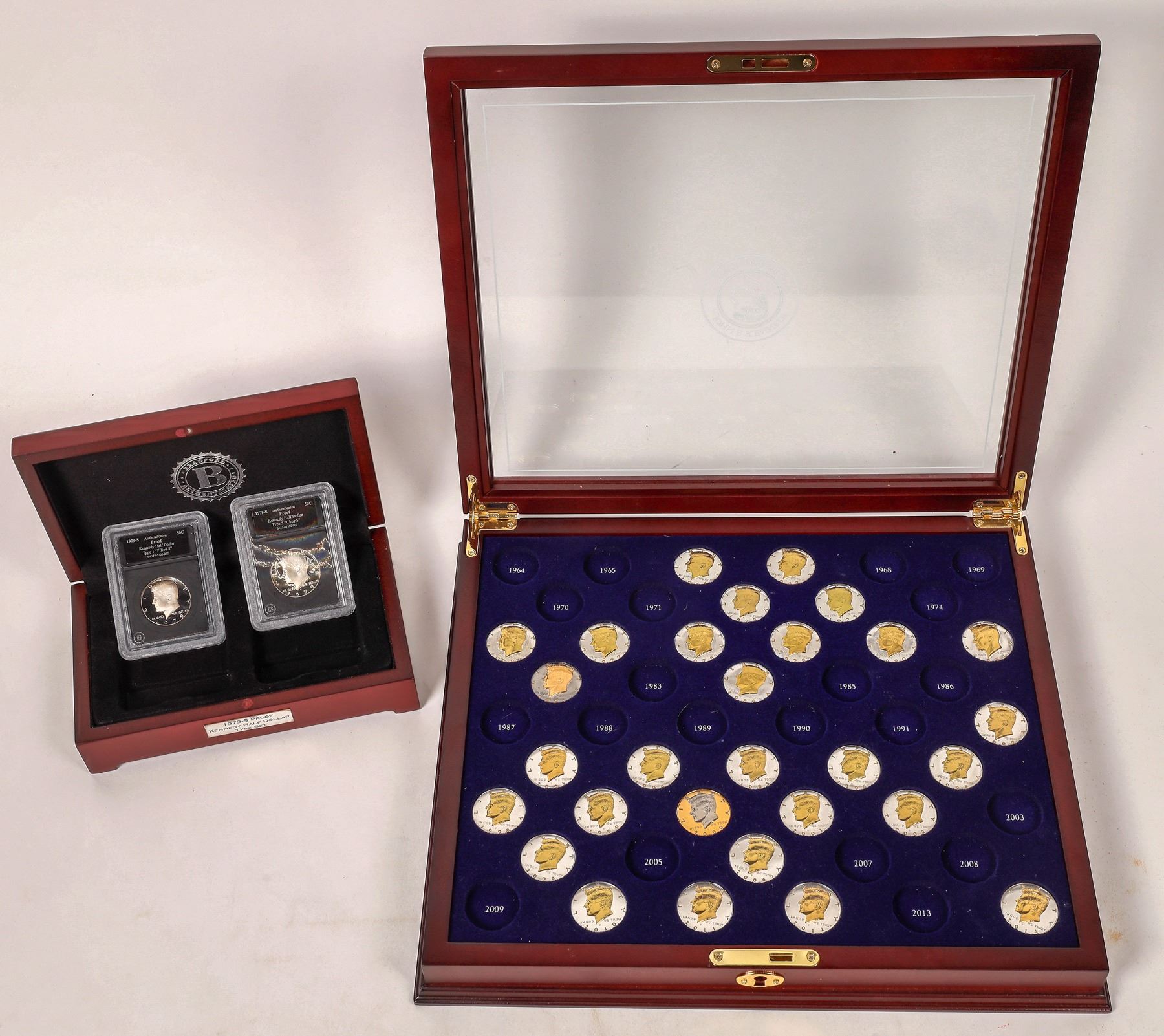Issued by the Bradford Exchange Mint: glass topped locking wooden case (14 x 12 x 2 inches) with 29 proof Kennedy half dollars that are gold plated. Two are 40% silver, the rest are later dates. 21 empty holes to complete the 1964-2014 collection. Also from Bradford Exchange Mint: The 1979-S Variety Kennedy Half Dollar Type Set: in a wooden case (8 x 5 x 2 inches) with two frosted proof Kennedy half dollars, one with the clear "S" mintmark, the other with the filled "S" mintmark. Includes certificate of authenticity.