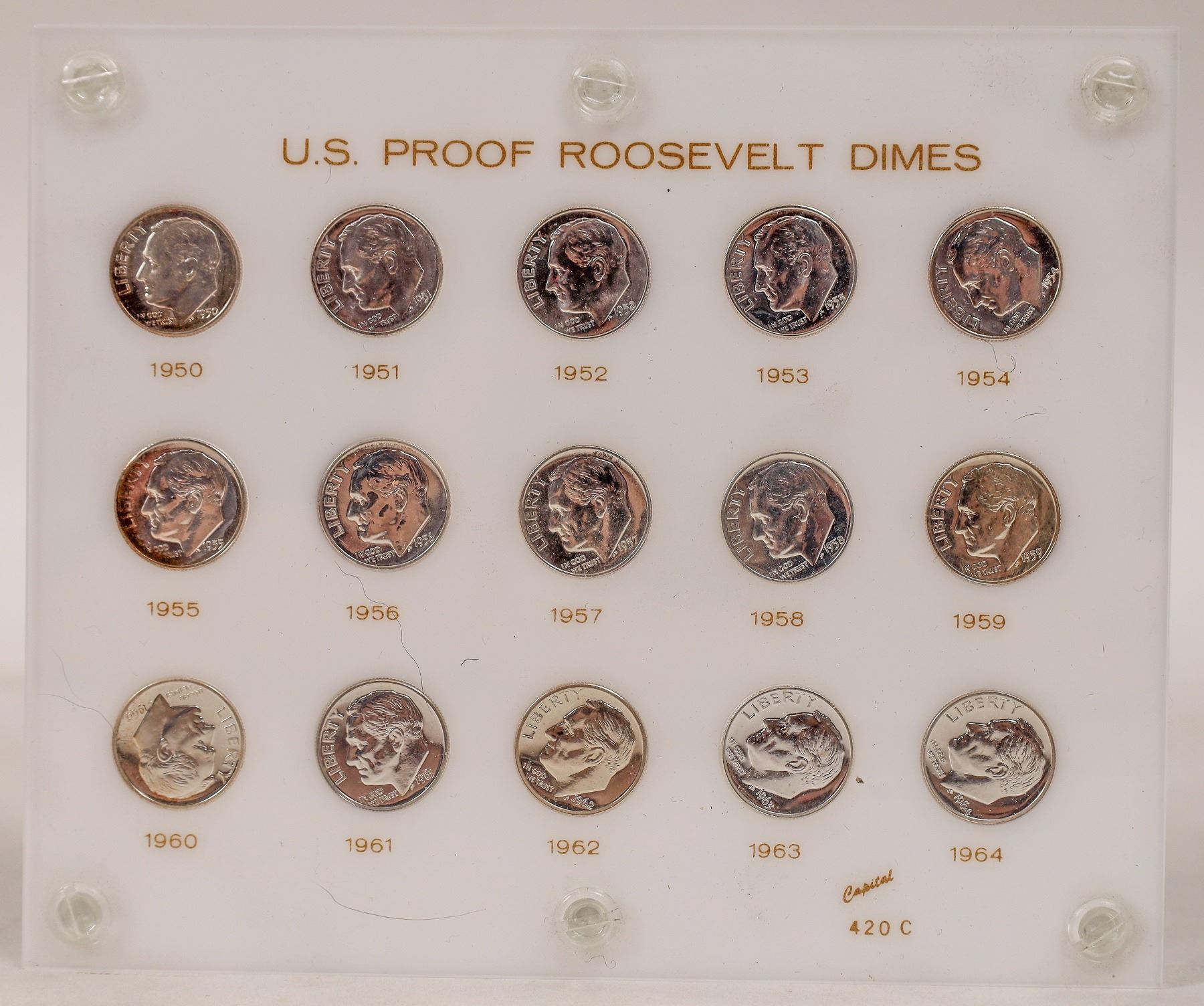 Capital Plastics holder 420C: U. S. Proof Roosevelt Dimes 1950-1964. 15 stunning proof ten cent pieces. Salvatore Falcone Collection