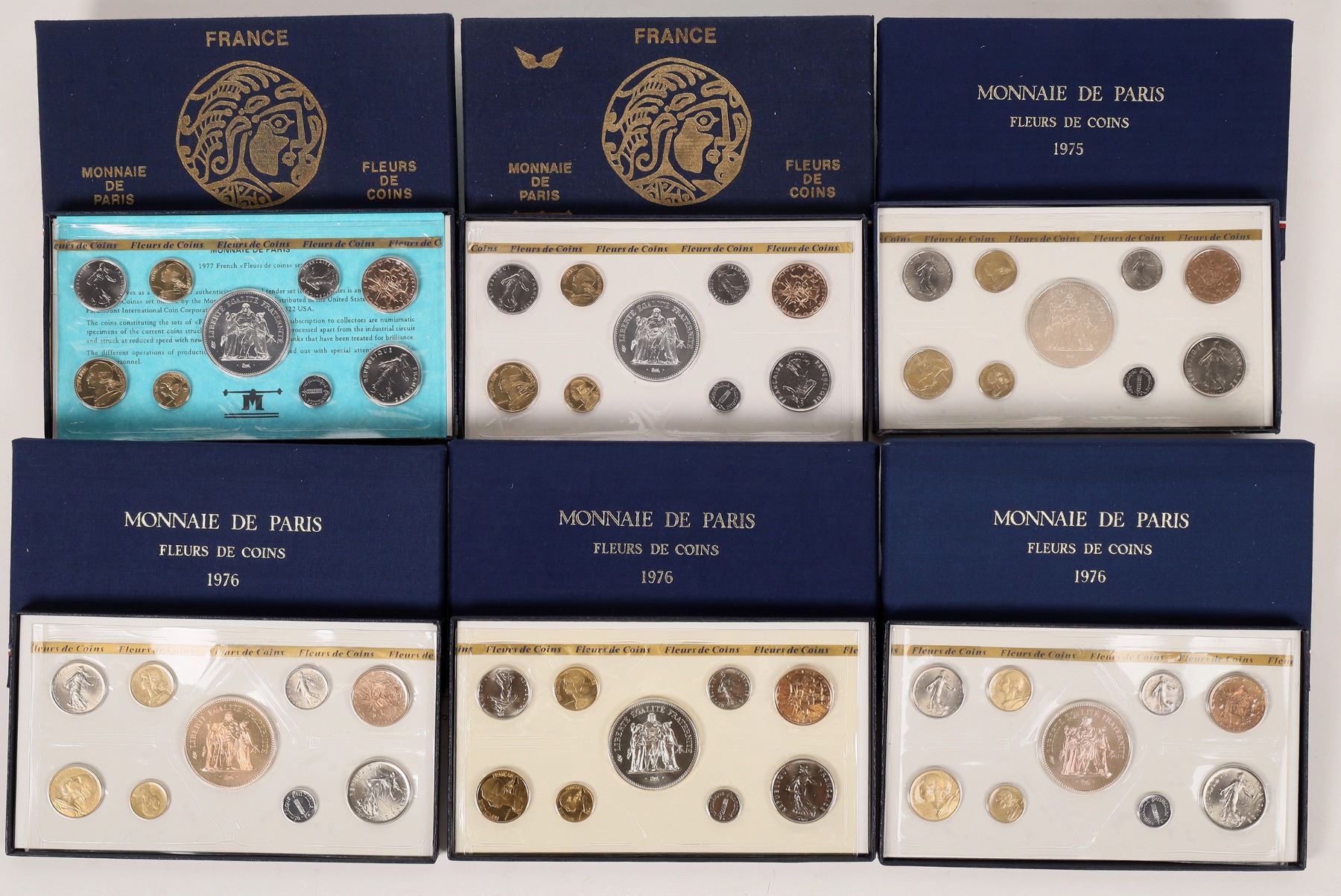 Lot of six proof sets of French coins. Minted by the Monnaie de Paris and distributed in the United States by Paramount International Coin Company. 1975, 1976(3), 1977 (2). Nine coin sets. France