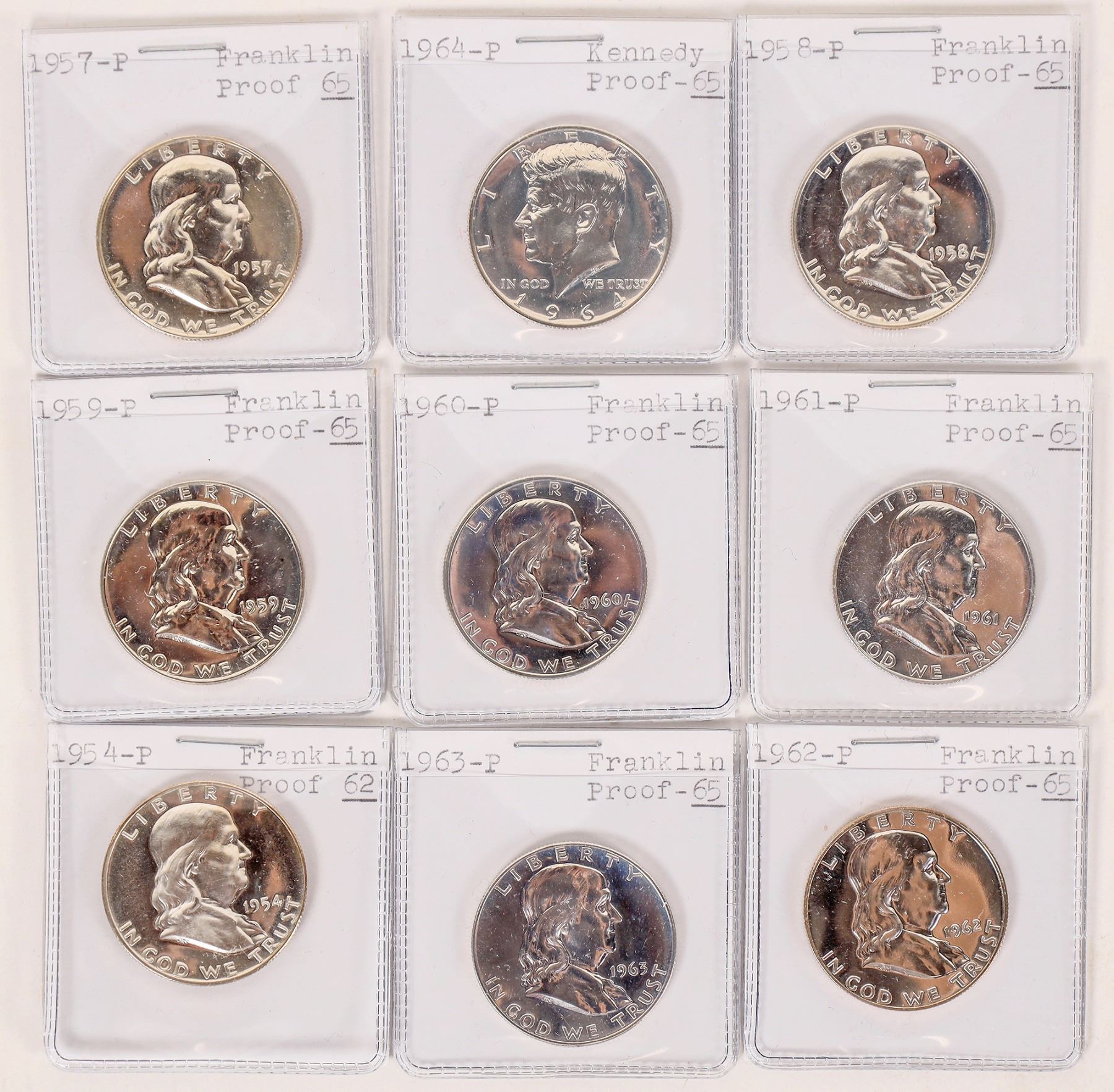 Lot of nine proof half dollars: Eight Franklins:1954, 1957, 1958, 1959, 1960, 1961, 1962, 1963; and one 1964 Kennedy half.