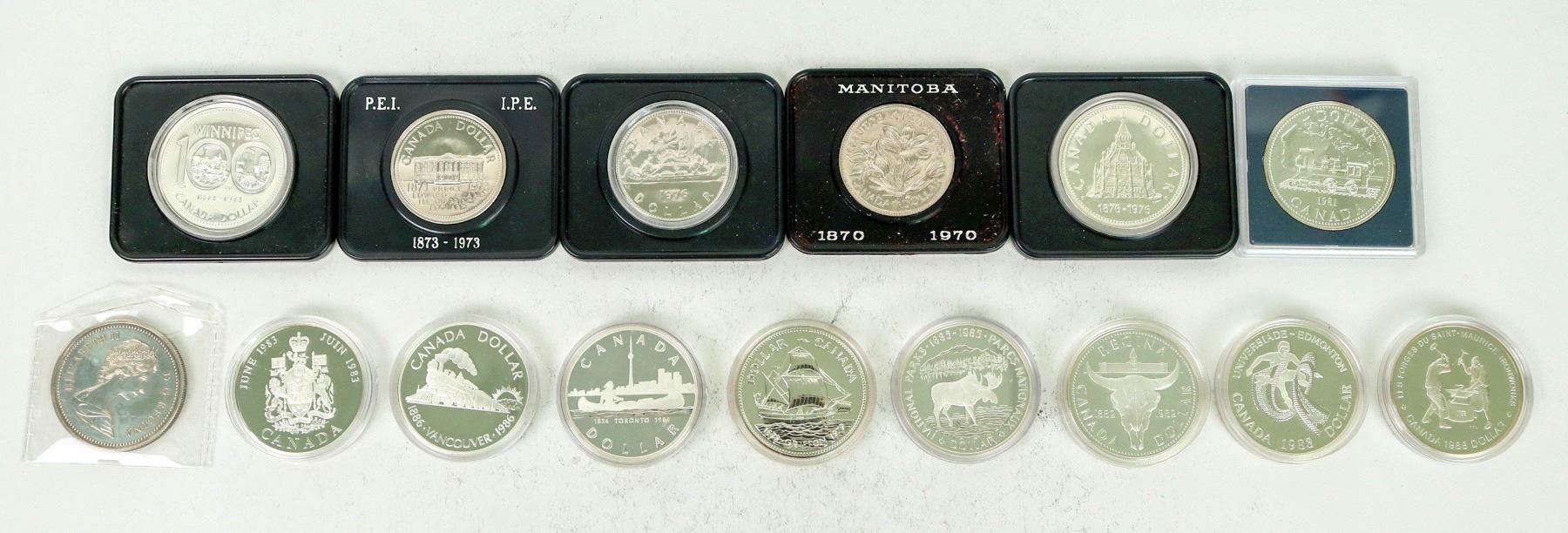 Sixteen Canadian one dollar coins, uncirculated and proof, in original Royal Mint cases: 1970, 1972; 1973, 1974;1976 (2);1979, 1981, 1982, 1983 (2); 1984; 1985; 1986; 1988; 2004. About six troy ounces total.