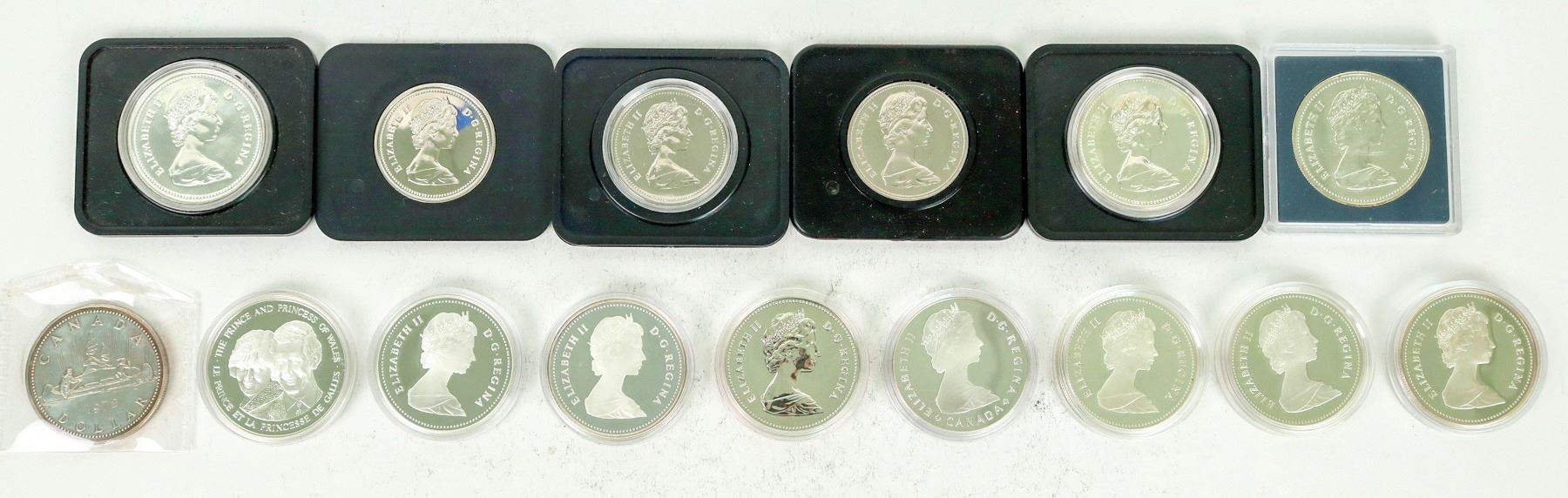 Sixteen Canadian one dollar coins, uncirculated and proof, in original Royal Mint cases: 1970, 1972; 1973, 1974;1976 (2);1979, 1981, 1982, 1983 (2); 1984; 1985; 1986; 1988; 2004. About six troy ounces total.