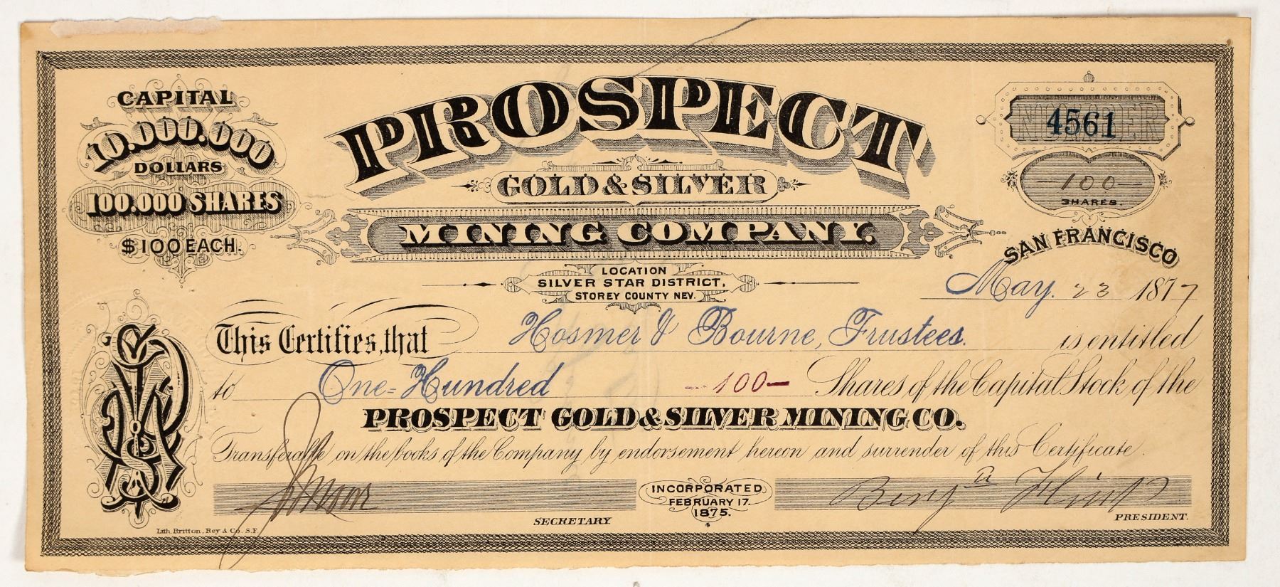 Rare. "Location Silver Star District, Storey County, Nev." printed below title. Inc. 1875. No. 4561, issued for 100 shares to Hosmer & Bourne in 1877. Signed by president Benj. Flint and secretary JP Moore. Not cancelled. Folds, pinholes, toning. Located west of the Occidental and on a parallel ledge. Vein is 180 ft. wide. In 1876, shaft is 250 ft. (Annual Mining Review & Stock Ledger, 1876, pg. 63). The Silver Star District was 1.25 miles east of Virginia City and Gold Hill and lies parallel to the Comstock Lode. It was later renamed the Brunswick District after the Brunswick Lode and then renamed again as the Comstock District.
