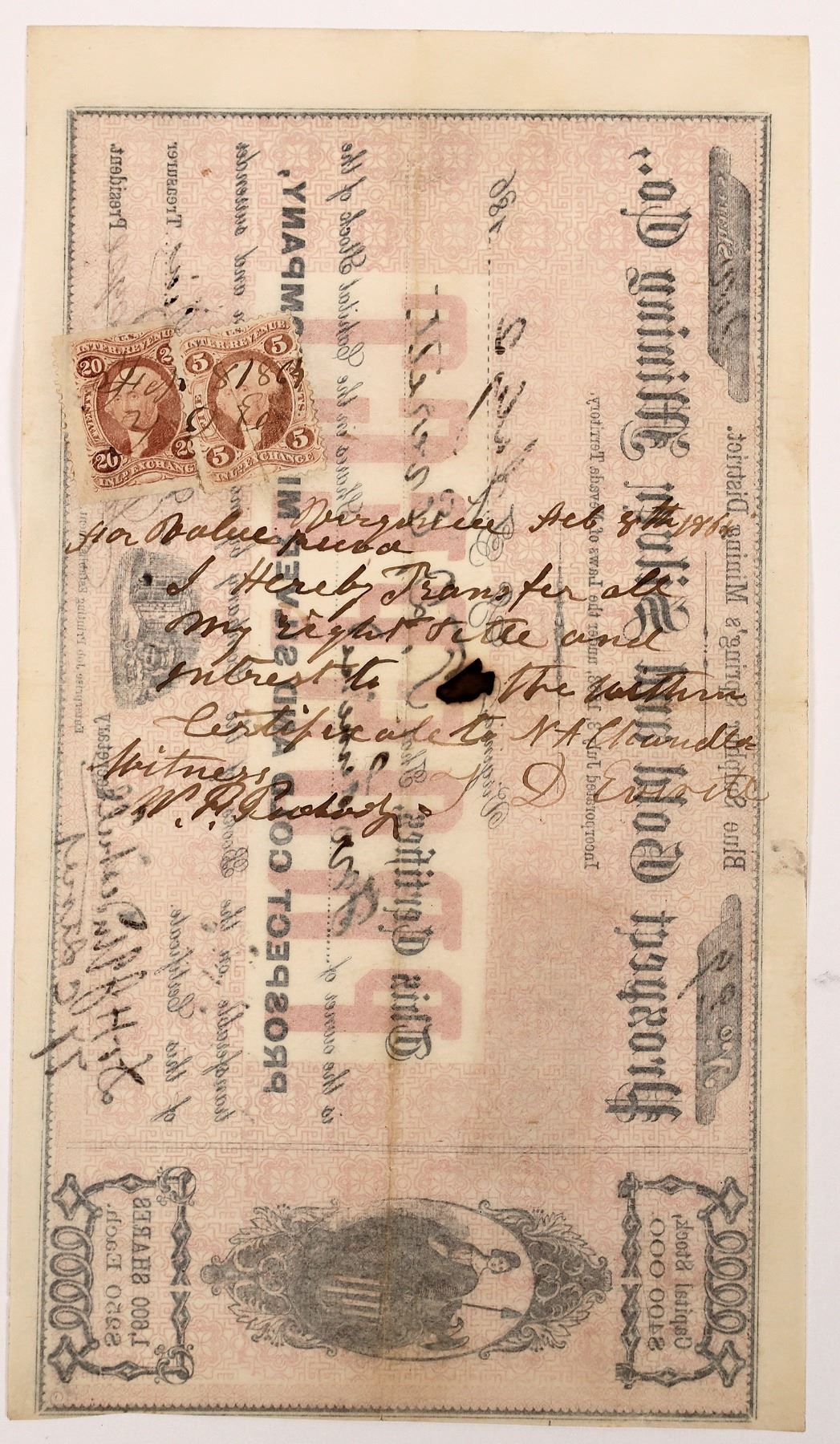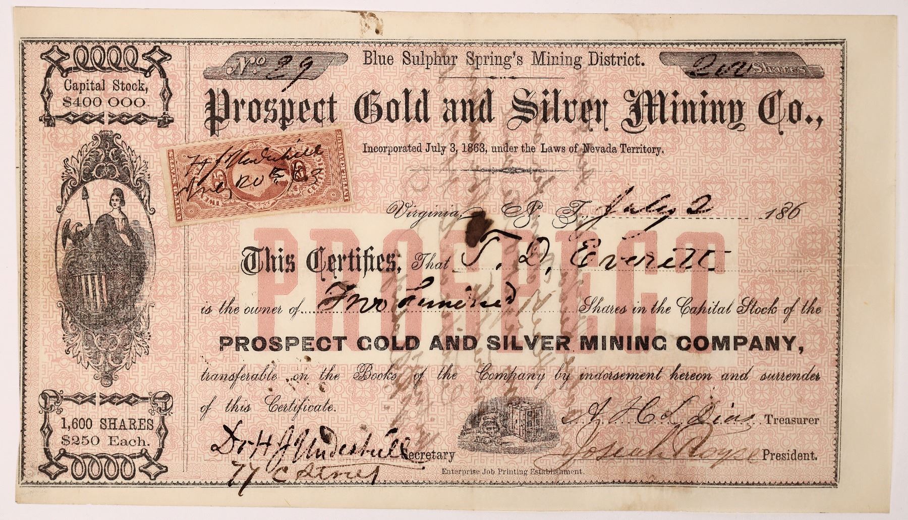 Prospect Gold and Silver Mining Co. Blue Sulphur Spring's Mining District - Nevada Territory Incorporated July 3, 1863. Rare, Imperforate 25-cent Internal Revenue Stamp.