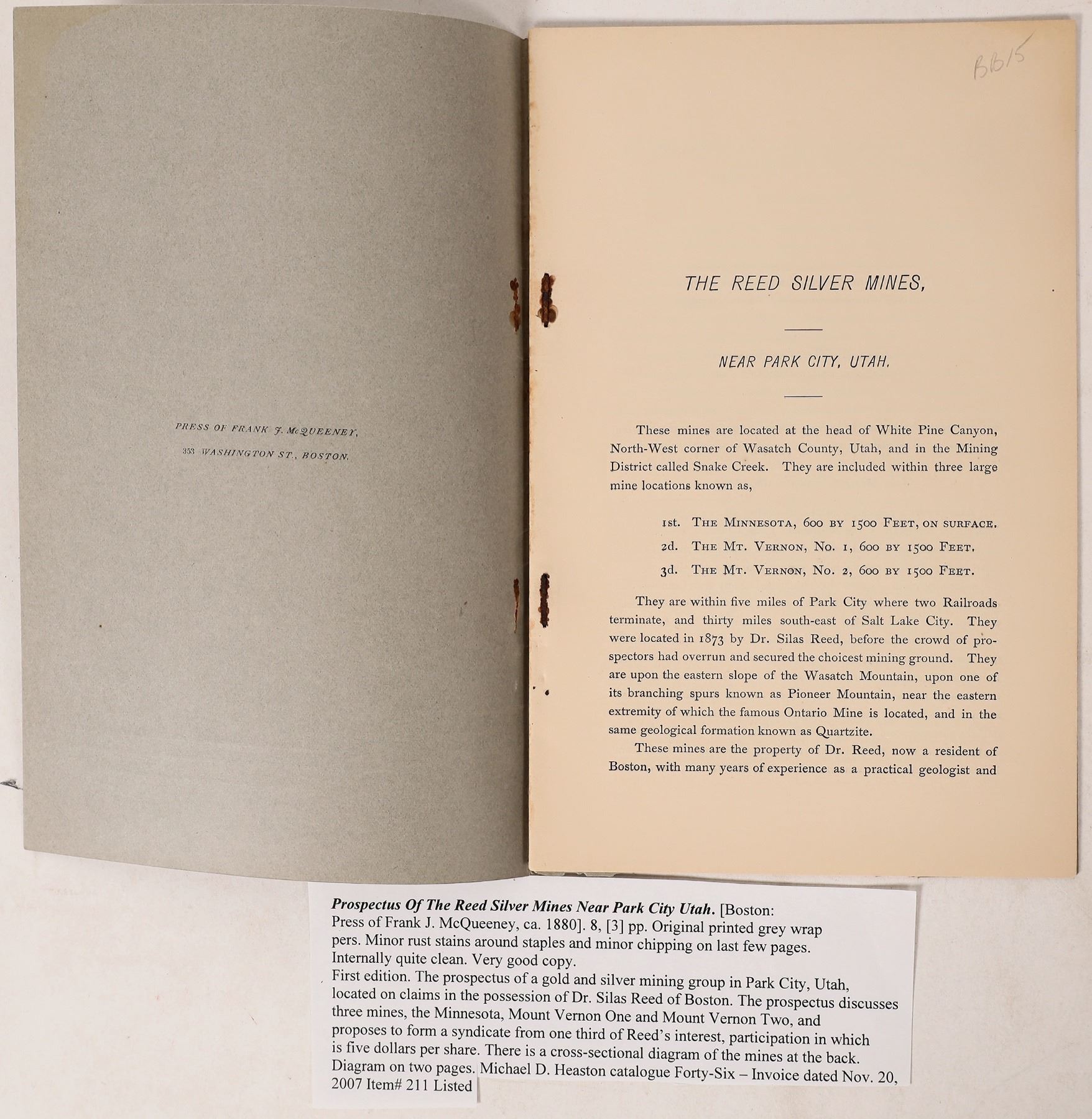 c1880. Ten pages. Last two are diagrams: cross-section of Pioneer Mountain and Top of Pioneer Mountain. First edition. Claims of Dr. Silas Reed. Prospectus describes Minnesota, Mount Vernon One and Mount Vernon two mines. Minor strains around staples and minor chipping. Park City Utah Franklin Collection