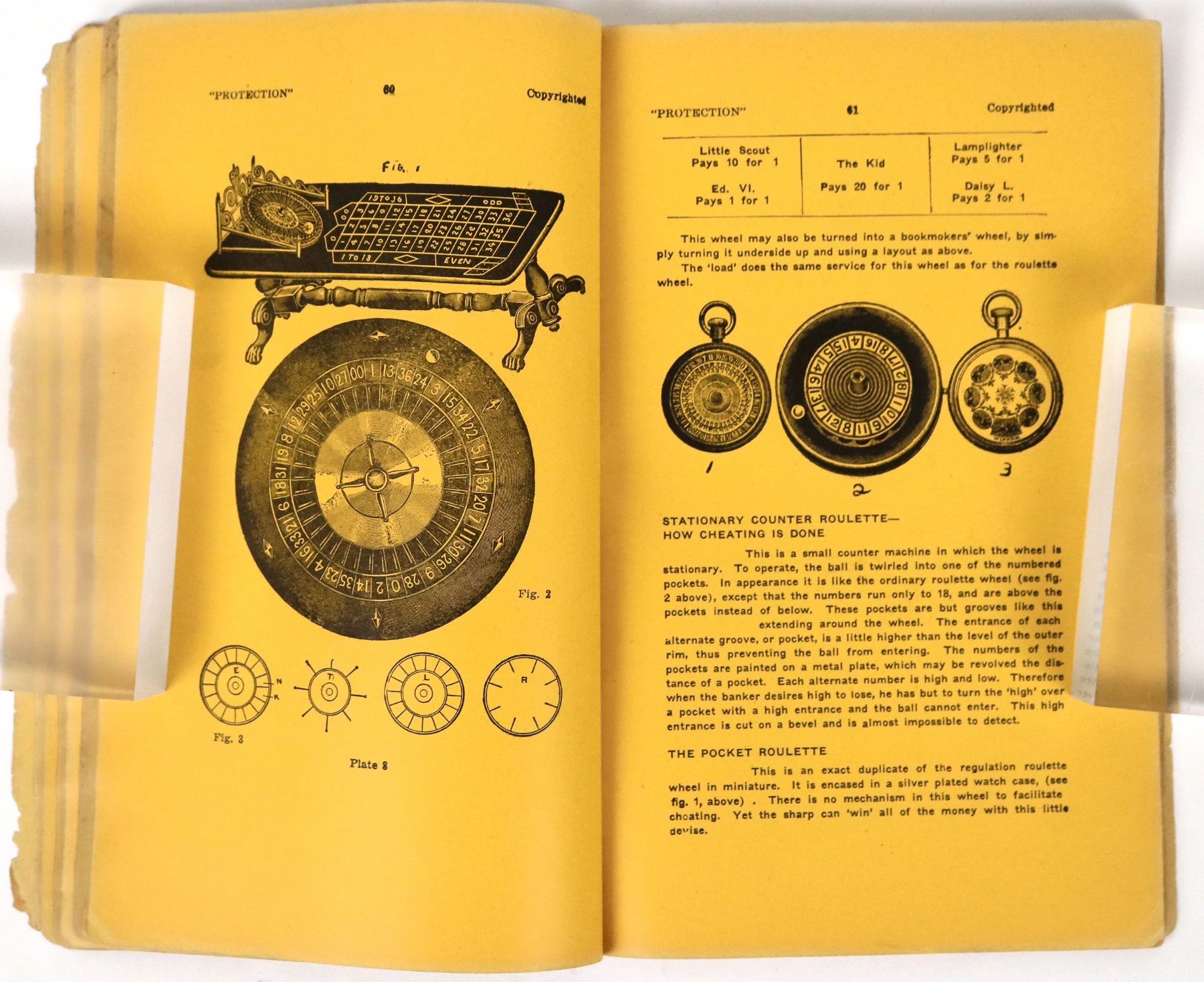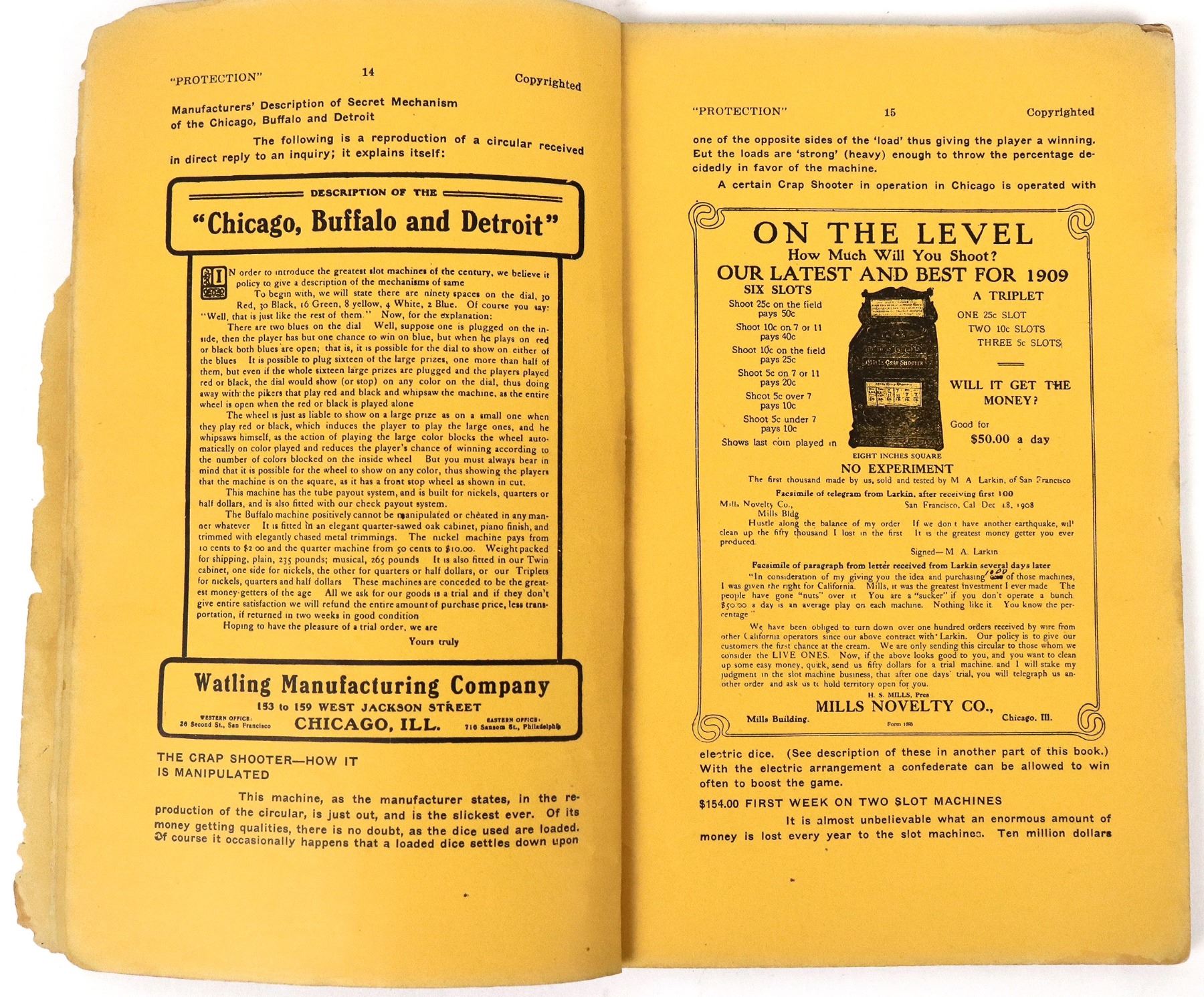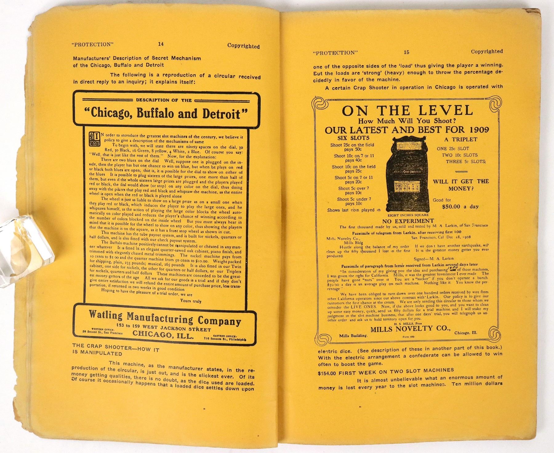 Protection, The Sealed Book by Joseph E Meyer. Possible first edition, missing both covers. Interesting illustrated treatise on slot machines and gaming. Lavishly illustration with gaming machine parts etc. Light staining. Please inspect, sold as is.