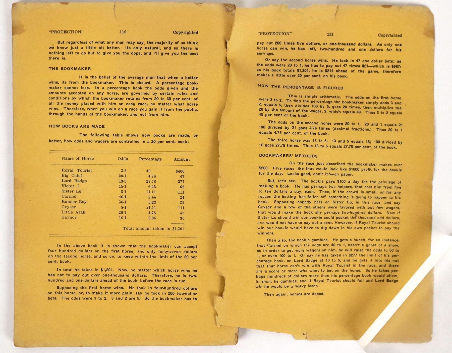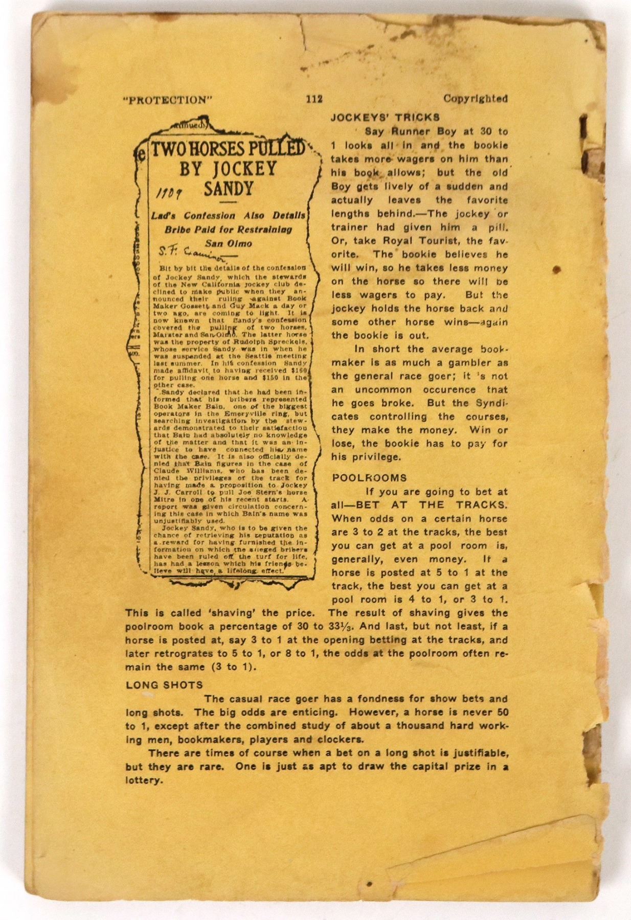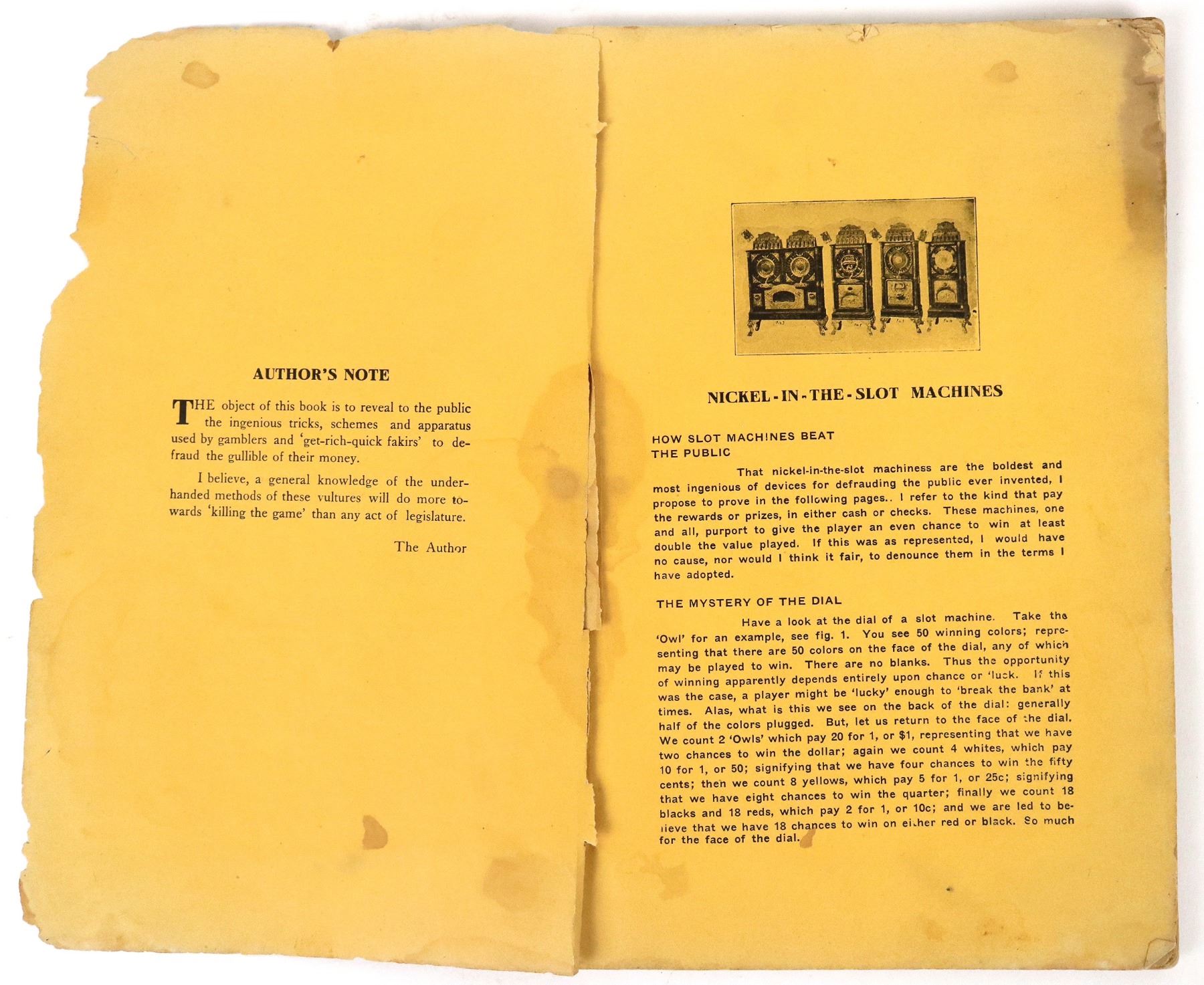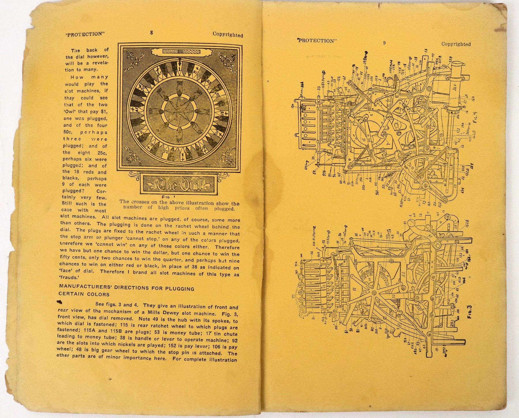 Protection, The Sealed Book by Joseph E Meyer. Possible first edition, missing both covers. Interesting illustrated treatise on slot machines and gaming. Lavishly illustration with gaming machine parts etc. Light staining. Please inspect, sold as is.