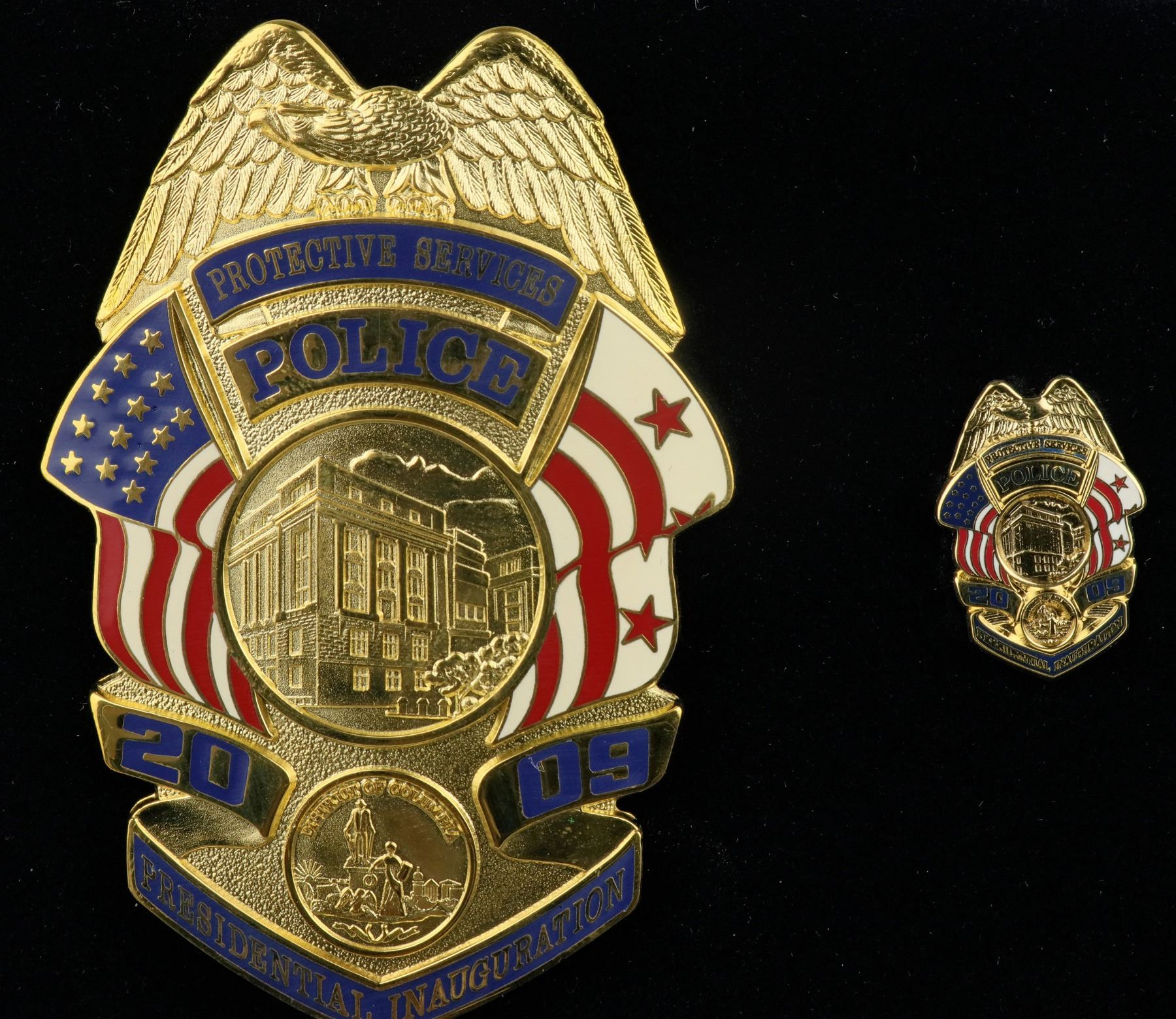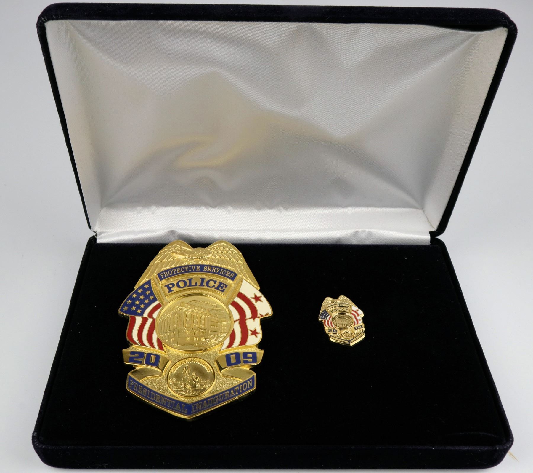 Made by Collinson: .102” solid brass, pure gold plate. #169, Protective Services Police, Congress BLdg center, American and DC flags on side. DC seal bottom. Lapel pin, mini version of badge. Velvet Presentation case, cert. from Collinson Co. Item is sold as a historical/collectible only. It does not convey, nor should it be used as an authority of any kind. Sale of this item is in full compliance with the United States Federal Law : 18 USC ss716. Impersonation of a police officer is a felony in most jurisdictions and subject to arrest.