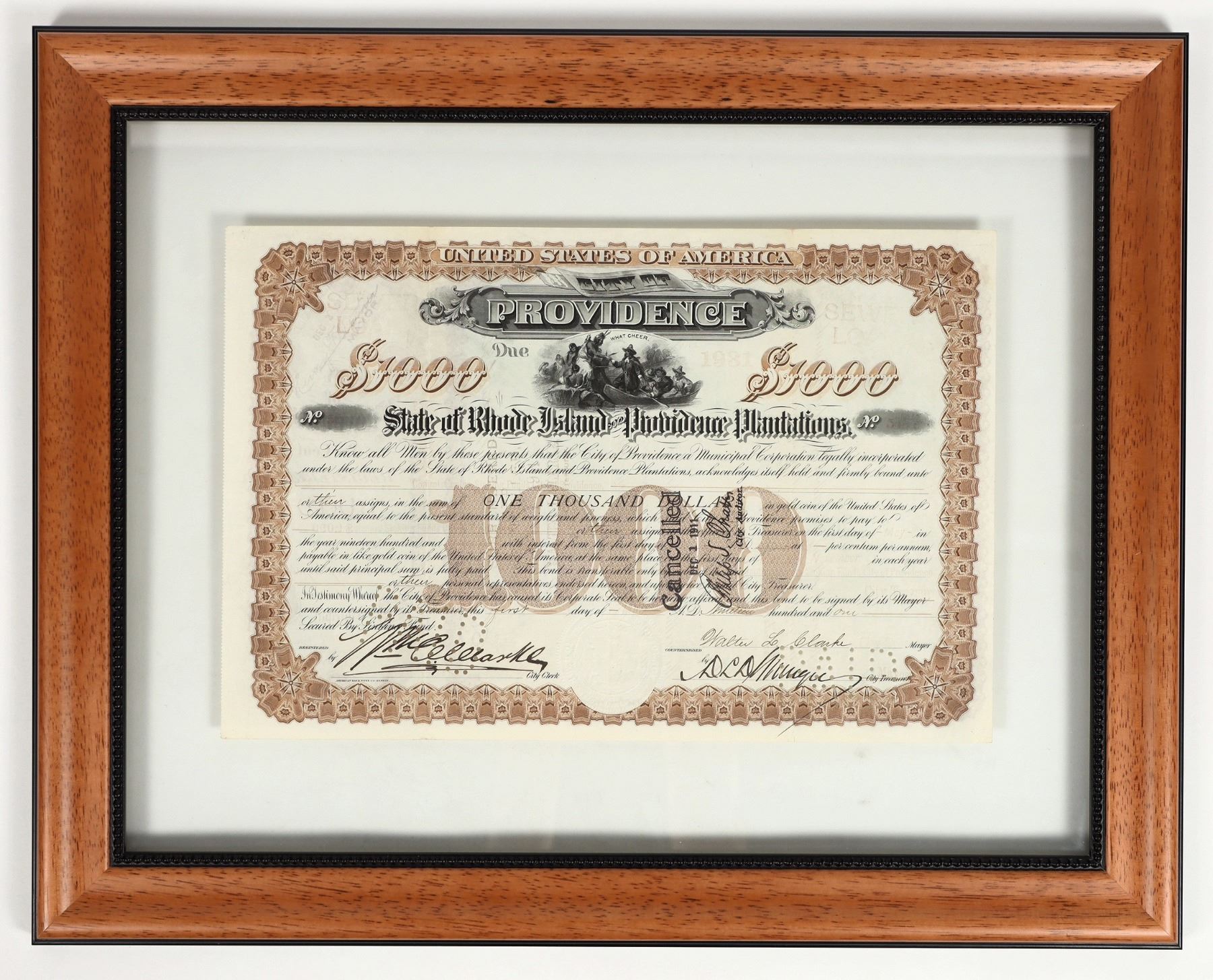 This is a Providence, Rhode Island city bond issued in 1901. The dated are barely visible. Beautifully framed to view both sides in a frame at 17 in. X 21.5 in. The bond has three folds, cancel perfed. without foxing at 9.5 in. X 14.25 in. A beautiful vignette of Indians welcoming pilgrims ashore in the center. Signed by the Major Walter L. Clark. The seal of Providence is pressure stamped center bottom. Please see photo for details.