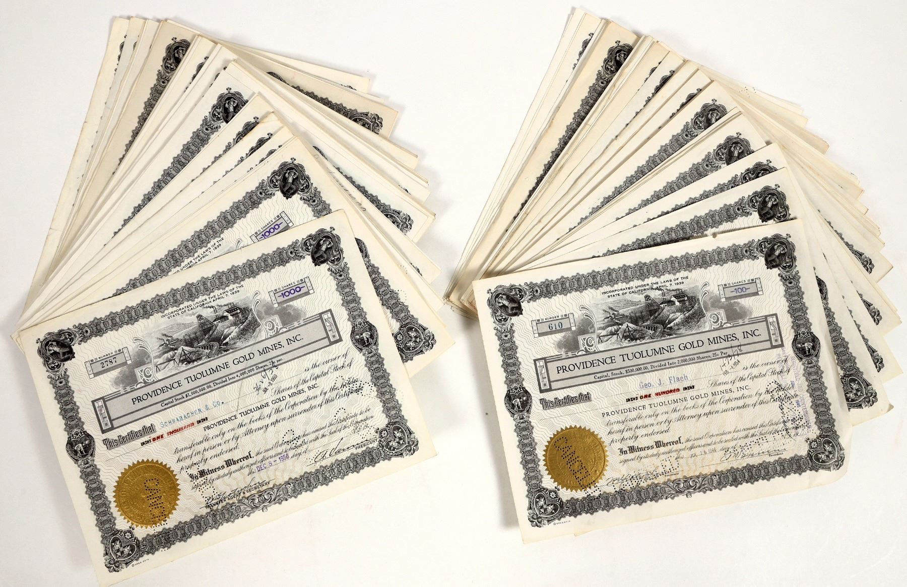 About 170 Providence Tuolumne Gold Mines, Inc. Stocks c. 1945-65. Issued, cancelled. One the Motherlode in California. Nice group.