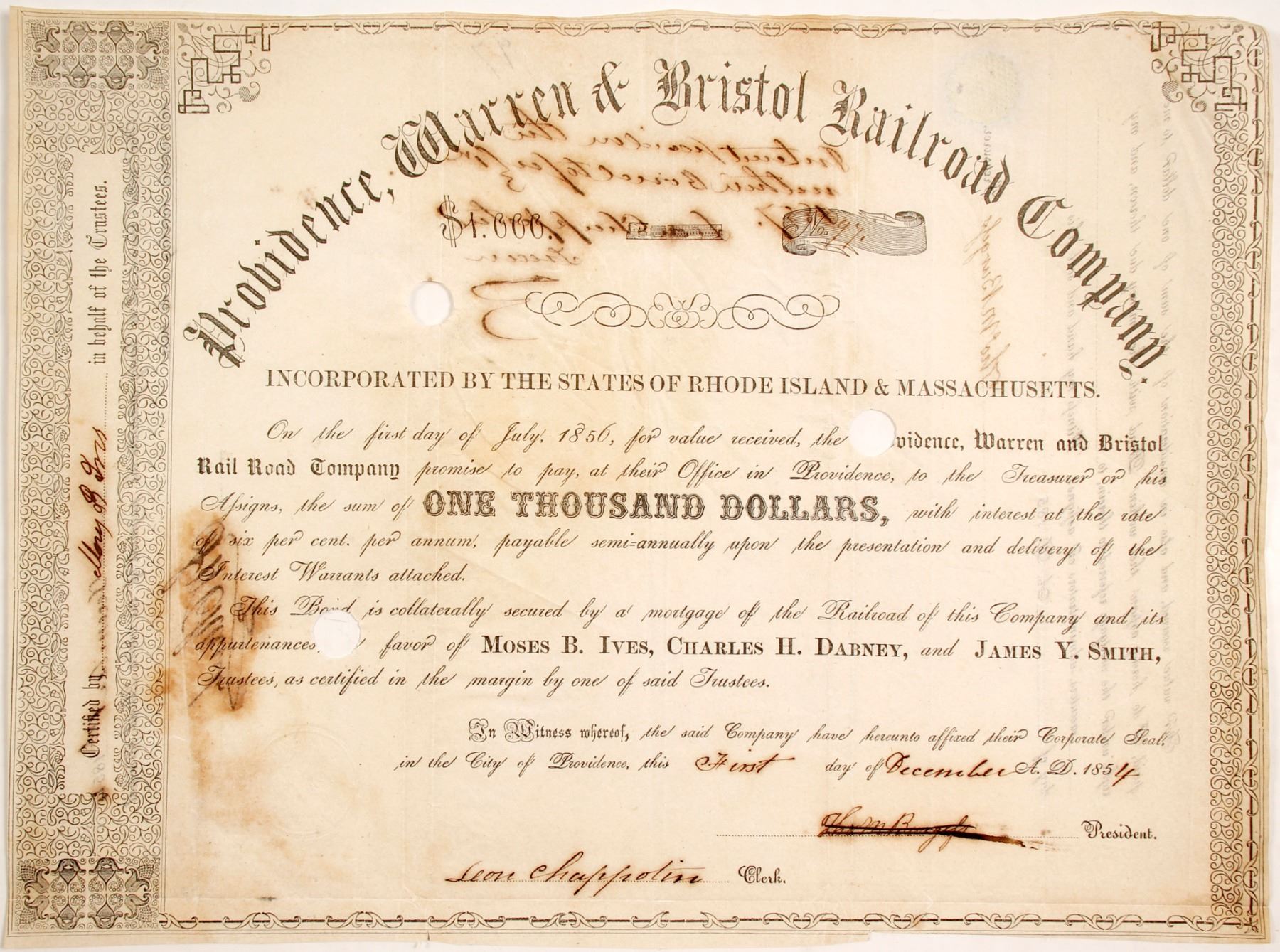 Unlisted. I/C #97 $1000 6% bond, signed by President illegible. "The Providence, Warren and Bristol Railroad was a railroad in Rhode Island that connected the city of Providence with Bristol, Rhode Island. The company was formed in 1854 by merging the Providence, Warren and Bristol Railroad Companies of Massachusetts and Rhode Island. The 14.1-mile line itself was completed on July 12, 1855. Until 1862, a portion of the line crossed through part of the town of Seekonk, Massachusetts, which then became East Providence, Rhode Island as part of a boundary settlement between the two states. In 1865, the Fall River, Warren and Providence Railroad built a branch off the line at Warren; in 1875, it was extended to Fall River, Massachusetts . On July 1, 1891, the line was leased to the Old Colony Railroad for 99 years. In 1893, the PW&B was absorbed into the New York, New Haven and Hartford Railroad, upon its lease of the Old Colony Railroad system." from wikipedia. rear ink bleed thru. Ken Prag Collection