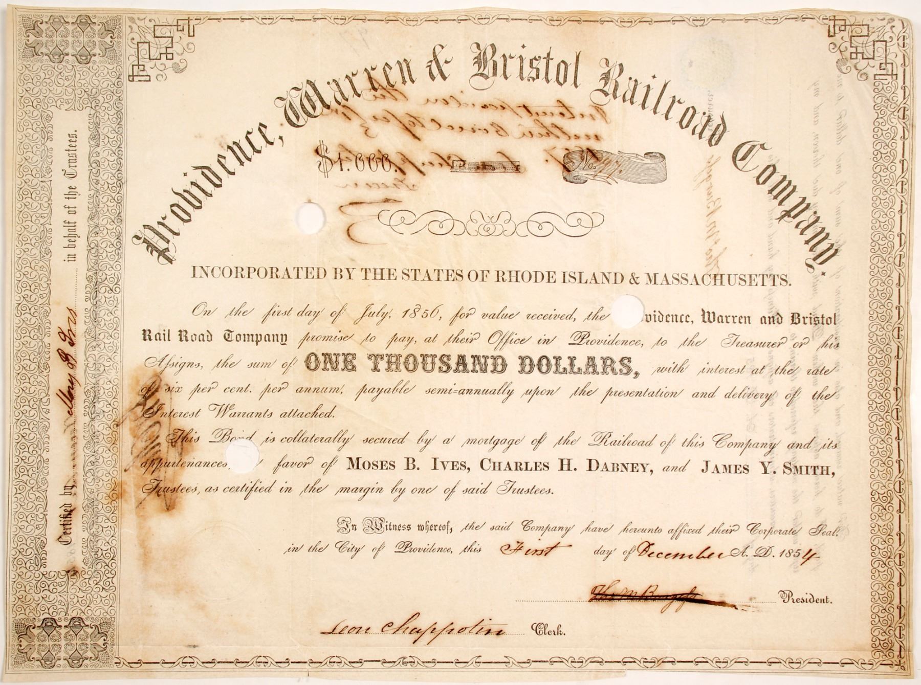 Unlisted. I/C #97 $1000 6% bond, signed by President illegible. "The Providence, Warren and Bristol Railroad was a railroad in Rhode Island that connected the city of Providence with Bristol, Rhode Island. The company was formed in 1854 by merging the Providence, Warren and Bristol Railroad Companies of Massachusetts and Rhode Island. The 14.1-mile line itself was completed on July 12, 1855. Until 1862, a portion of the line crossed through part of the town of Seekonk, Massachusetts, which then became East Providence, Rhode Island as part of a boundary settlement between the two states. In 1865, the Fall River, Warren and Providence Railroad built a branch off the line at Warren; in 1875, it was extended to Fall River, Massachusetts . On July 1, 1891, the line was leased to the Old Colony Railroad for 99 years. In 1893, the PW&B was absorbed into the New York, New Haven and Hartford Railroad, upon its lease of the Old Colony Railroad system." from wikipedia. rear ink bleed thru. Prag Collection State: City: Date: 1854 HWAC# 84918