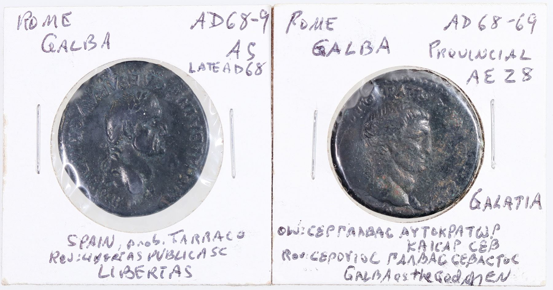 Two provincial coins of Galba: Galatia and Spain. both fine with fine portraits. Libertas Publica on Spanish As. Galba as the God Men on the AE 28. The coins of Galba are rare as he only ruled a few months.
