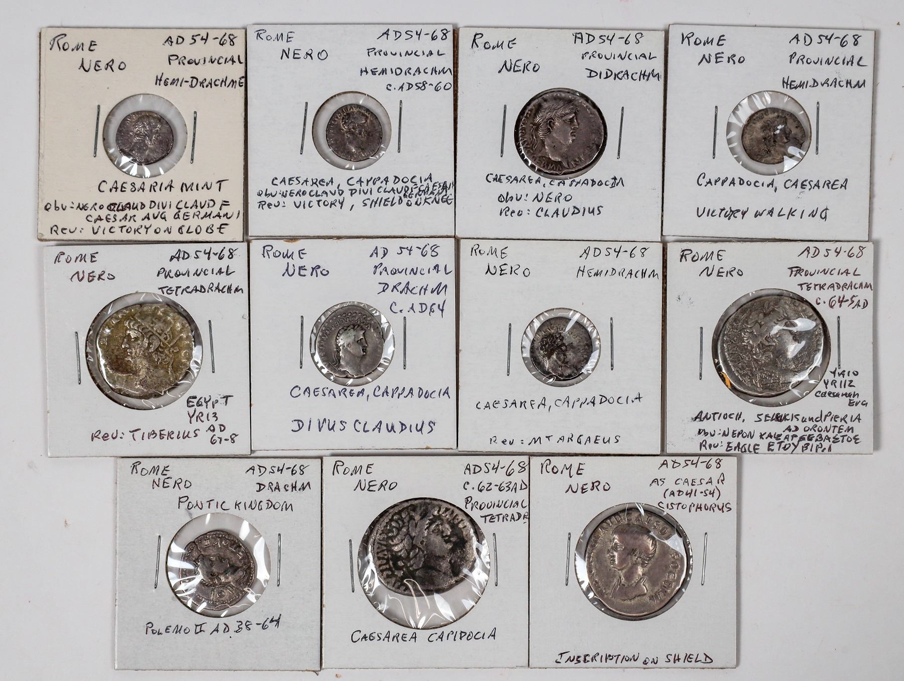 Lot of eleven provincial coins of Nero. Cistophorus, three tetradrachms, didrachm, two drachm, four hemidrachm. Coins from Egypt, Antioch, Cappadocia, Pontic Kingdom. Depicting eagle, shield, Tiberius, Claudius, Polemo II, Mt. Argaeus, Nike on globe , Nike and Nike inscriging shield. All about fine or better.