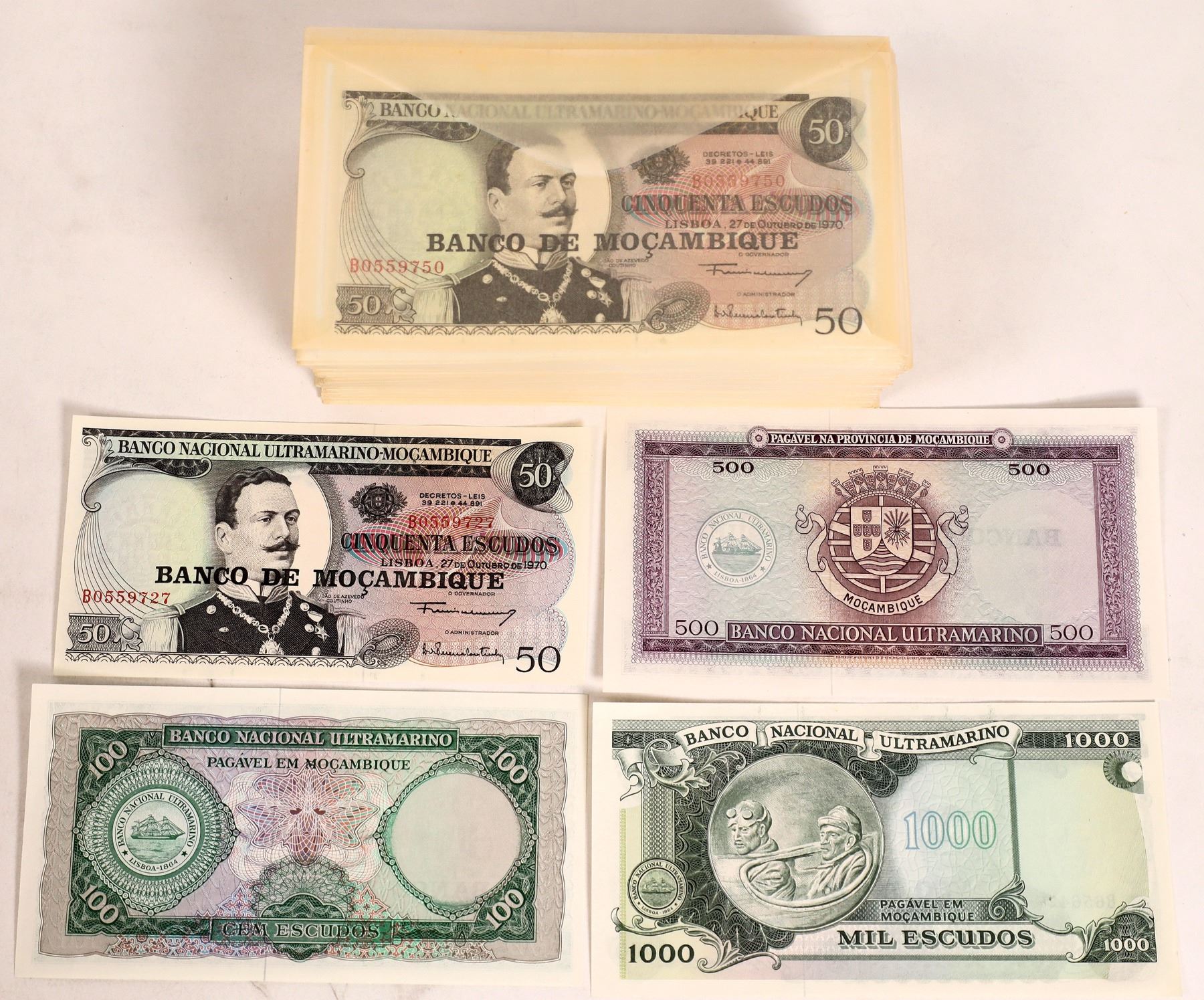 Dealers lot of Mozambique provisional issue currency (Pick #116-119). Crisp uncirculated four note sets: 50, 100, 500 & 1000 Escudos, in plastic envelopes. Over 90 sets.
