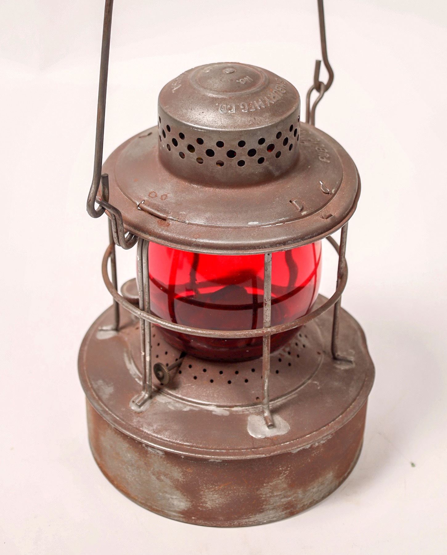 Kerosene, ruby red globe. Made by Embury. 10". Wire basket base.