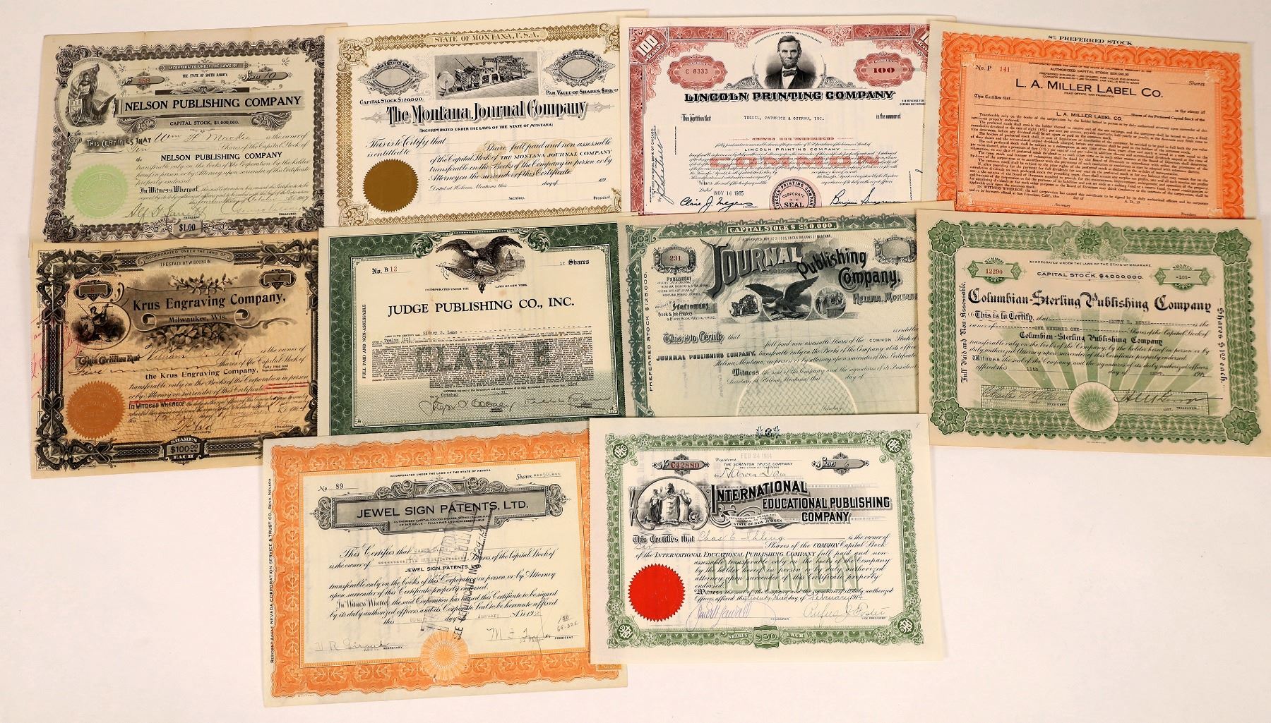 Lot of 10 different. Includes: The Montana Journal Company (uniss., 1890s, pictorial); Lincoln Printing Co. (1965, Lincoln vignette); LA Miller Label Co. (uniss); Krus Engraving Company (Milwaukee, 1904); Judge Publishing Co. (1931); Journal Publishing Co. (Helena, uniss., 1890s); Columbian-Sterling Publishing Co. (1911); Jewel Sign Patents, Ltd. (1932); International Educational Publishing Co. (1914); and Nelson Publishing Co. (1909).