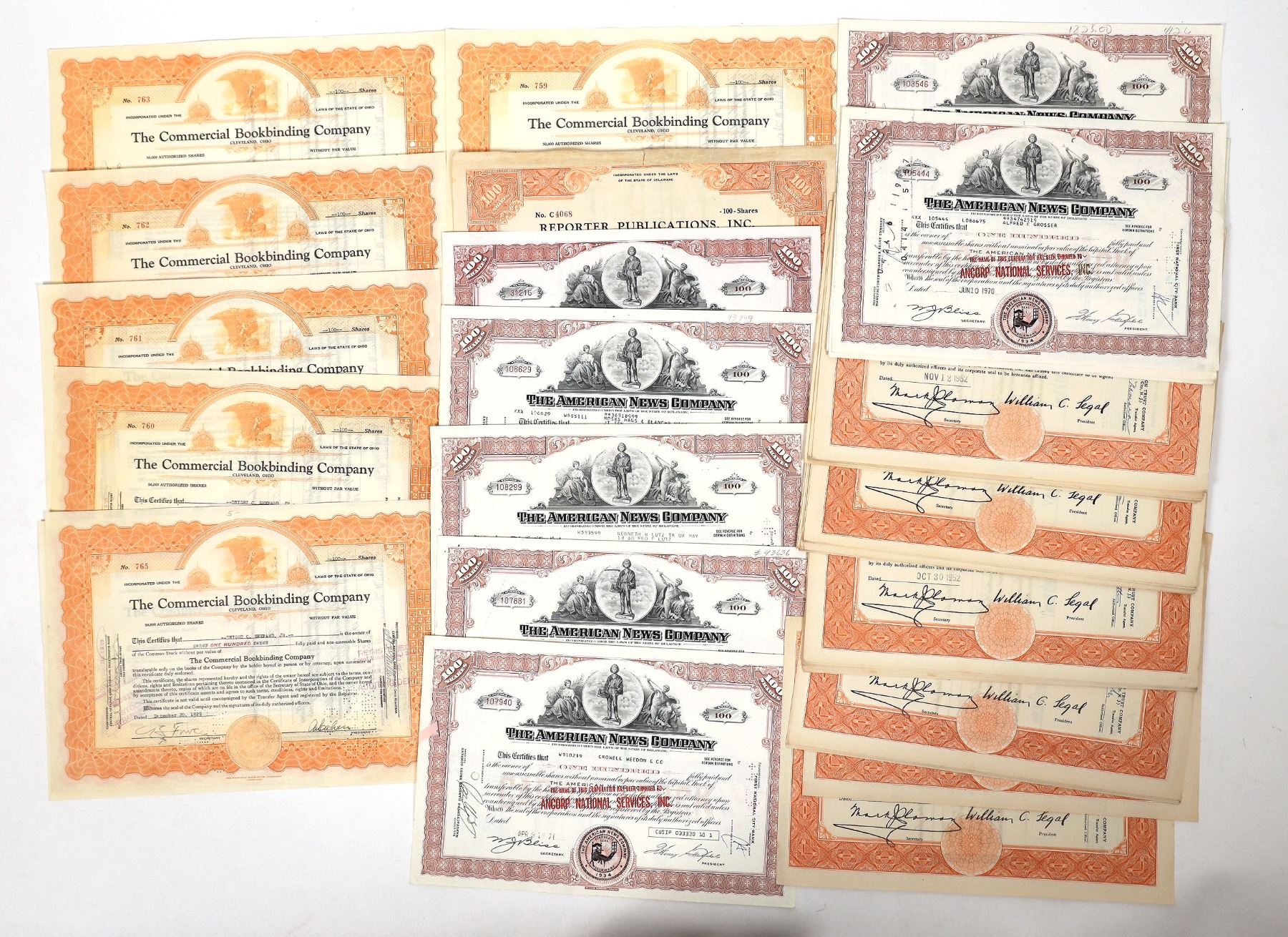 A group of 62 stocks certificates from three different U.S. publishing companies: 42 stocks from Reporter Publications Inc., 13 stocks from the American News Company, and 7 stocks in the Commercial Bookbinding Company. The stocks date from 1929 to 1956. All certificates have been signed by the president and secretary of their respective companies. The Reporter Publications stocks are uncancelled; the American News and Commercial Bookbinding stocks have been cancelled with both hole punch and ink stamp cancellations. Excellent vignette of a newsboy on the American News certificates. All in great condition.
