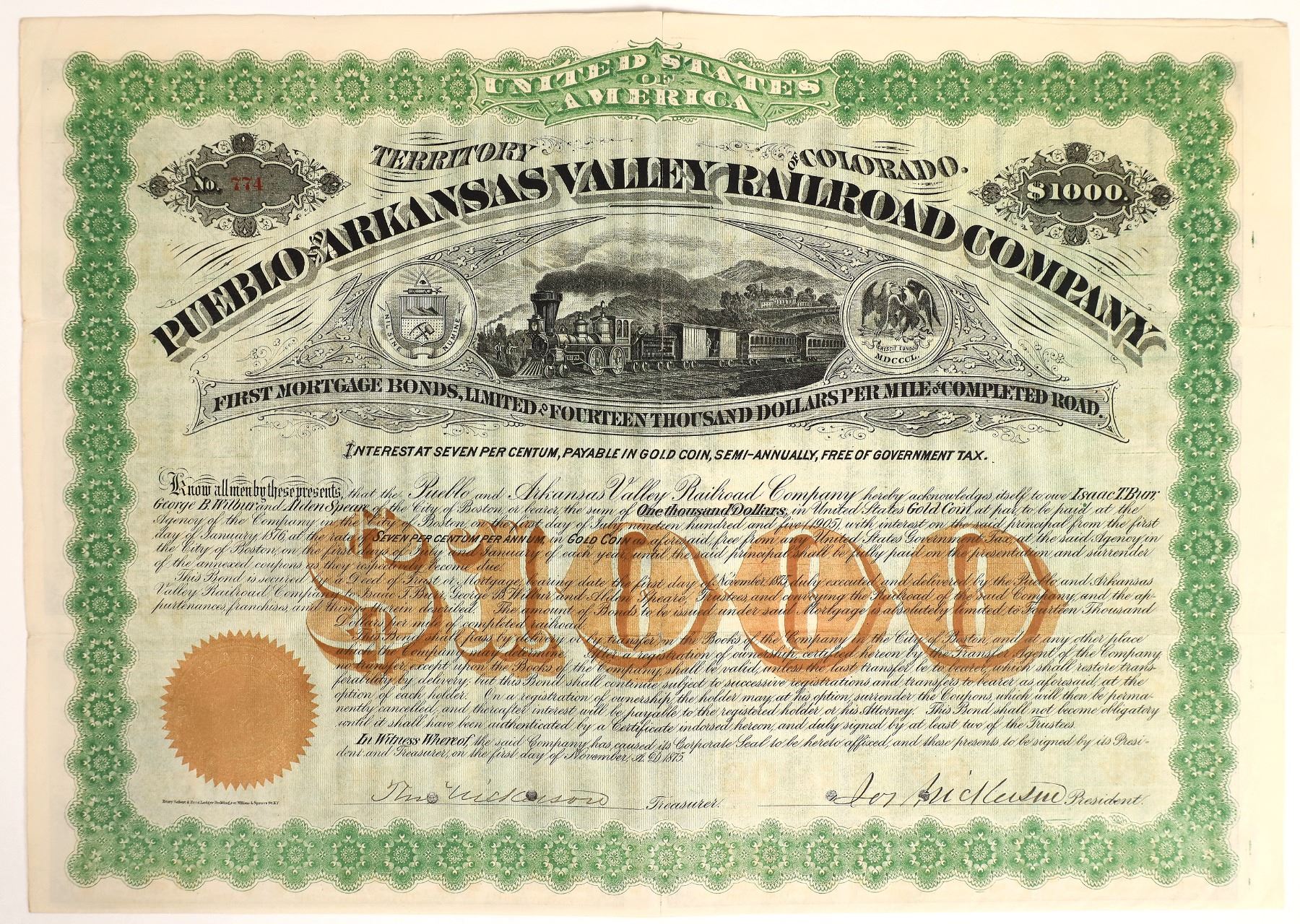 Colorado Territory bond, Pueblo and Arkansas Valley Railroad Company of Colorado, issued 1875. This line was formed to build a line for the Atchison, Topeka & Sante Fe from Granada to La Junta to Pueblo (completed March 1876).