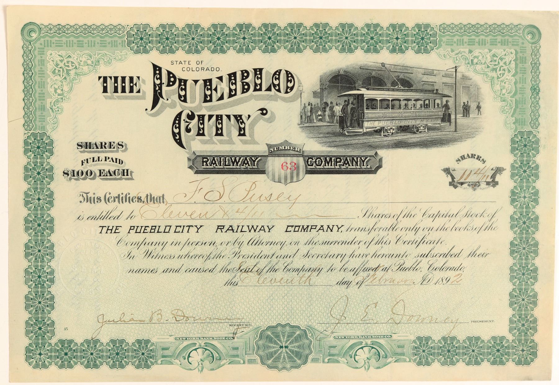 Stock Certificate from the Pueblo City Railway Co. Incorporated in the State of Colorado. Certificate number 63 issued in 1892 at Pueblo to F.S. Peirsey(?). Signed by J.E. Downey, and Julian B. Downey. Size 11 by 7.5 inches. Overall nice. Not cancelled. Trolley car vignette. This was the 1889 reorganization of the Pueblo Street Railroad Co., a horsecar line founded in 1879. The new company was granted franchises by the city for constructing and operating an electric railway along the principal streets. Over twenty miles of the electric line were constructed during 1890, where thirteen miles of horse cars were operated previously.