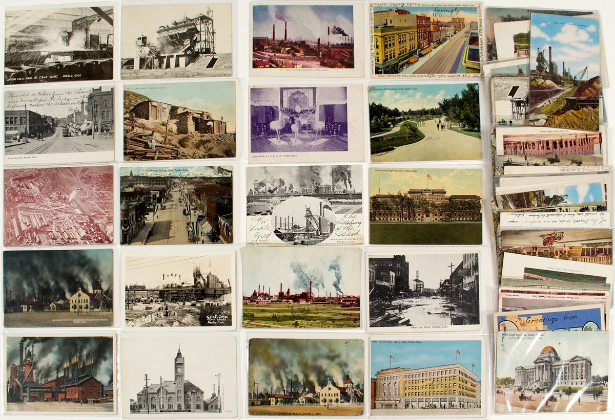 Lot of 59 postcards. 2 RPC's: C. F. I. Corp. Steel Works, Pueblo; Main street, North of 3rd St.., Pueblo (Davidson Brothers Real Photographic Series). Nine b/w cards c. 1905-15. 21 PC postmarked 1905-18; 3 post 1940 cards; 24 hand colored cards, not dates, images appear to be old. ( Prag Collection) City: Pueblo State: Colorado Date: ID# 31717