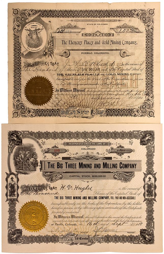 Lot of 2. 1. The Ebenezer Placer and Gold Mining Company. Incorporated in 1900. No. 241 issued to J. A. Eklund by [illegible], Secretary, and F. (?) Hitchcock, President, on 1 January 1900 for 100 shares. Unusual vignette of a moose head. U/C. Some folding and ink smudges. Good condition. 2. The Big Three Mining and Milling Company, a Colorado corporation. No. 109 issued to H. V. Hughes by M. Jachetta, Secretary, and J. O. Burns, President, on 16 September 1918 for 1,000 shares. U/C. Excellent.