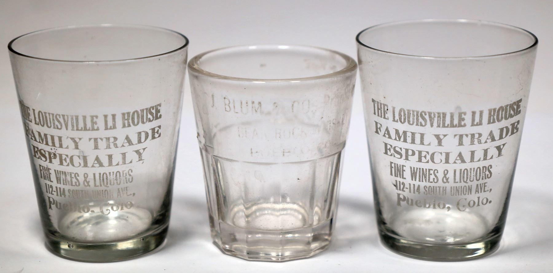 Lot of 3. 1 & 2) Identical shot glasses for The Louisville Li House, Fine Wines & Liquors, 112-114 South Union Ave., Pueblo. 2.5"H x 2"W. Bubbles, light wear. 3) J. Blum & Co., Prop. of Bear Rock Whiskey, Pueblo. 2.25"H x 2"W. Small chip on inner rim, haziness, some rubbing off of the lettering. Please inspect.