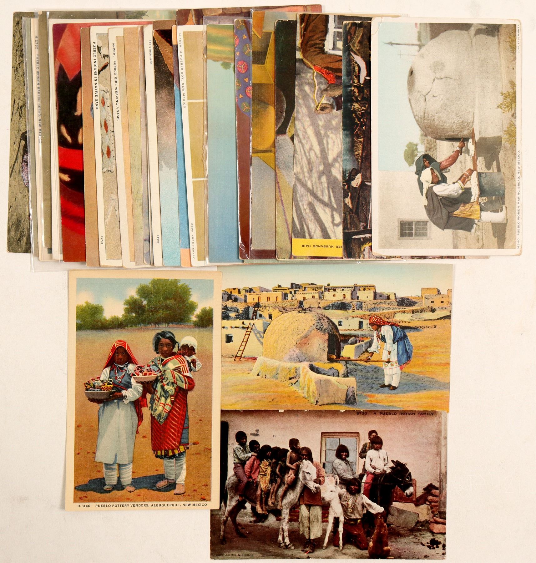 30 different color photographs of Pueblo Indians. There are photographs of baking bread in their ovens, grinding corn, making pottery, dancing, their people with babies in a papoose. Brian Thaler Collection