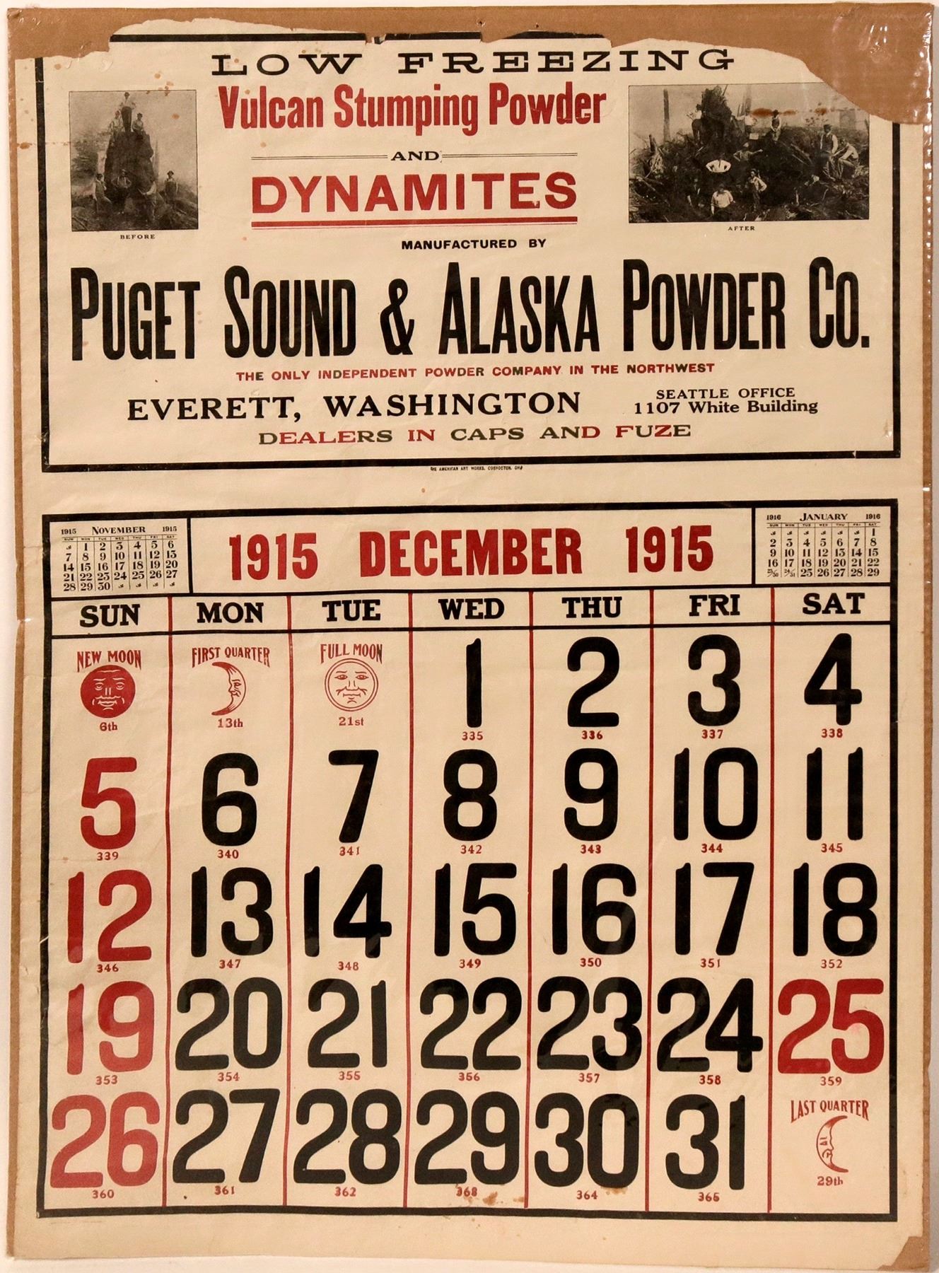 Very rare advertising calendar from Puget Sound & Alaska Powder Co., Dec. 1915. The company manufactured Low Freezing Vulcan Stumping Powder and Dynamites. The company was the only independent powder company in the northwest. Offices in Everett, Washington, and Seattle. Dealers in Caps and Fuze. Some paper loss on top edge and top left and right corner. Very cool.